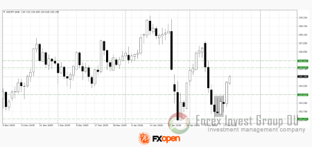 Валютная пара USD/JPY после тестирования зоны поддержки вблизи январских минимумов перешла к развитию восходящей коррекции. Технический анализ USD/JPY указывает на возможность укрепления к 155.80–156.30, так как на дневном таймфрейме сформирована комбинация «бычье поглощение». Сценарий роста может быть отменён при уверенном закреплении ниже 154.00.