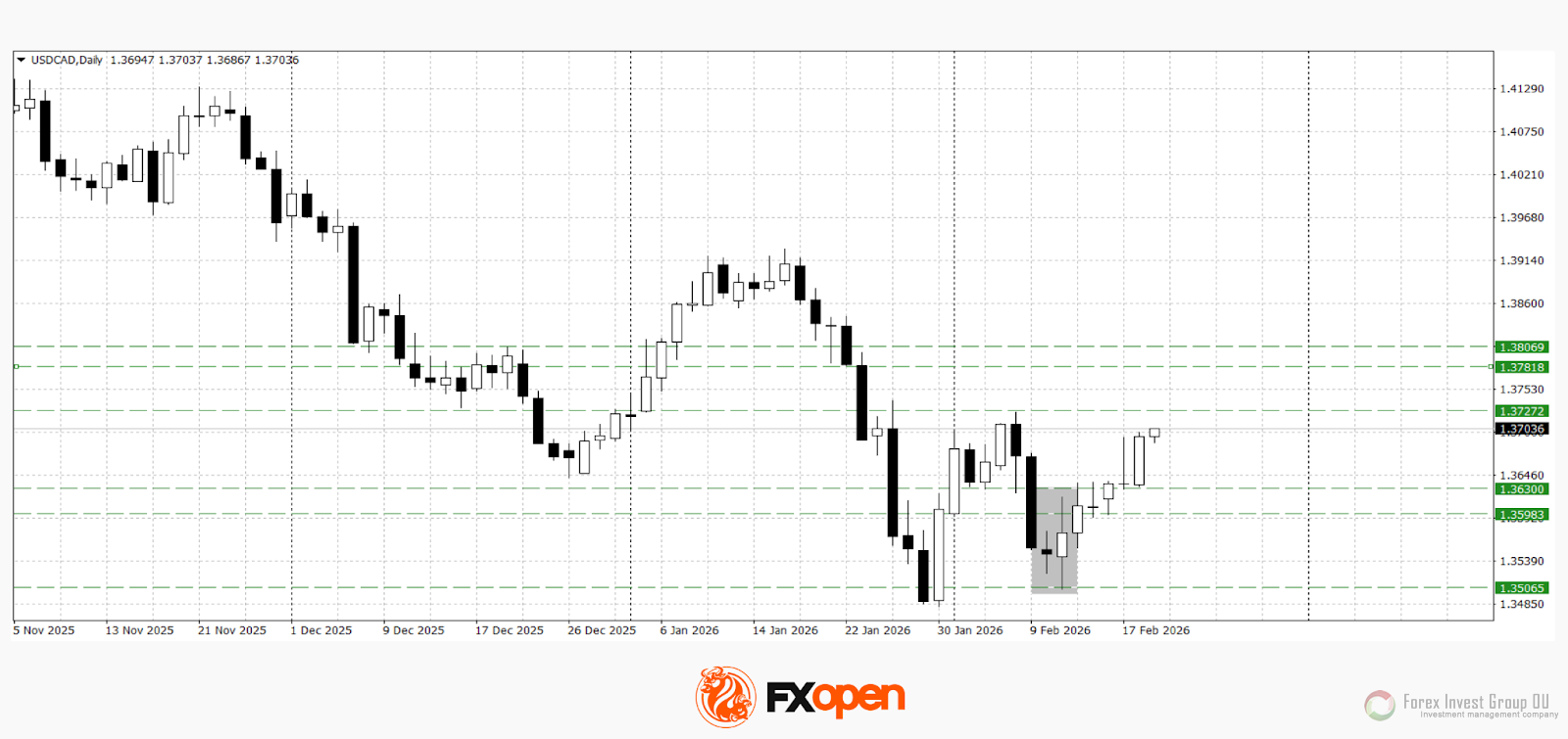 В паре USD/CAD также наблюдается отскок от области январских минимумов и формирование разворотной комбинации. В настоящее время пара приблизилась к важному сопротивлению 1.3700. Если в ближайшие торговые сессии покупатели сумеют закрепиться выше этого уровня, возможно продолжение роста в диапазон 1.3730–1.3800. В то же время снижение ниже 1.3630–1.3590 может способствовать повторному тесту отметки 1.3500.