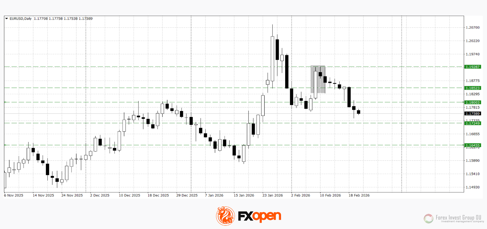 FxSignal 20-02-2026, 14:00 71 Аналитика, прогнозы валютного рынкаEUR/USD и GBP/USD продолжили снижение, обновив недавние экстремумы после восходящей коррекции, сформированной на прошлой неделе. Попытка восстановления носила технический характер и не изменила общей структуры движения. Дополнительное давление на европейские валюты оказало укрепление доллара после публикации в среду протоколов Федерального комитета по операциям на открытом рынке, которые продемонстрировали осторожный подход регулятора и отсутствие сигналов к скорому смягчению политики. Это усилило позиции американской валюты и стало катализатором нового нисходящего импульса по EUR/USD и GBP/USD.