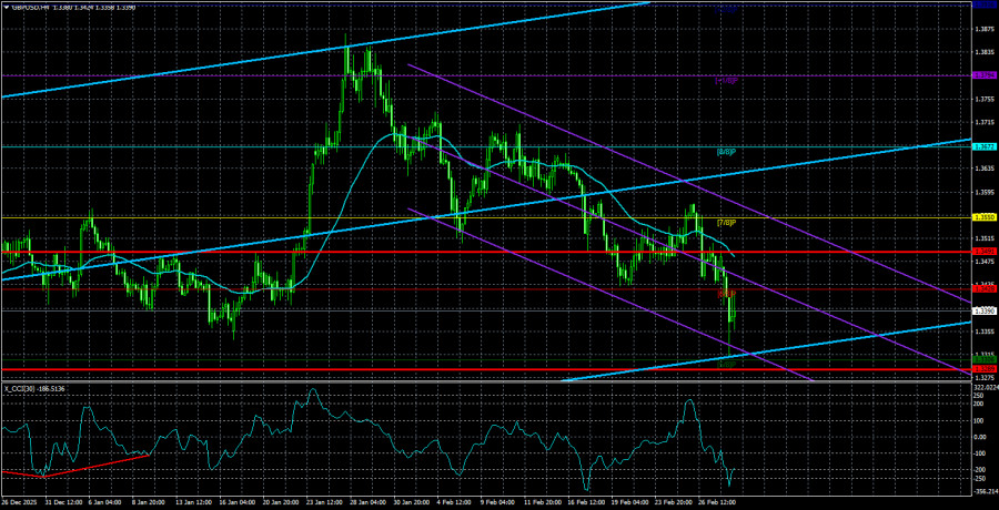 Валютная пара GBP/USD сохраняет нисходящую тенденцию на 4-часовом ТФ, а в понедельник обрушилась вниз. Мы не считаем, что дальнейшее укрепление американской валюты гарантировано, и даже по поводу роста доллара в понедельник сомневались. Объясняется такая точка зрения достаточно просто. Рынок был готов к тому, что на Ближнем Востоке начнется очередная война. Возможно, он не был готов к тому, что иранские ракеты полетят не только по Израилю или американским военным кораблям в Персидском заливе. Но к новому военному противостоянию рынок был готов. Понедельник по итогу остался за долларом, и теперь американская валюта может в любой момент завершить рост, а может – расти еще долго и счастливо. Геополитика – это крайне сложный фактор для анализа. Геополитические конфликты, как показывает практика, могут длиться годами. Однако вряд ли трейдеры будут годами скупать доллар на фоне одной лишь геополитики. Как правило, рынок реагирует на начало очередной войны или же на громкие события, связанные с войной, которые повлияют на товарные, сырьевые или энергетические рынки. Блокировка Ираном Ормузского пролива – это событие мирового значения. Таким образом, в реальности доллар может дорожать не из-за самого факта начала войны между Ираном и союзниками США(как мы уже говорили, к новому конфликту на Ближнем Востоке трейдеры были готовы), а из-за блокировки Ормузского пролива, через который проходит 25% всей транспортируемой нефти в мире, и что уже спровоцировало резкий рост цен на нефть и газ. Доллар США в итоге растет уже больше месяца. Вначале он рос на коррекции против сильного обвала в январе-месяце. Затем из Великобритании поступил целый пакет разочаровывающей статистики. После этого в США вышло буквально несколько отчетов, которые могли поддержать доллар, и рынок принял их за чистую монету. Ну а примерно две недели назад обстановка вокруг Ирана начала накаляться, и рынок начал готовиться к новой войне. В итоге, мы видим рост американской валюты, который невозможно было предсказать. Никто не мог месяц назад с уверенностью сказать, что между Ираном и целой группой стран начнется полноценная война. Никто не мог знать, какие результаты покажут ключевые макроэкономические показатели США и Великобритании в феврале. Таким образом, все текущее движение пары GBP/USD на Юг – это результат локальных событий, но никак не общей тенденции, которая, напомним, остается восходящей на всех старших ТФ. Где и когда закончится текущее падение, предсказать также нельзя. Все будет зависеть теперь от развития событий на Ближнем Востоке. Чем сильнее будет разгораться война, которую начал «главный миротворец 21 века» Трамп, тем сильнее может расти доллар США, понижая спрос на американские товары и сырье в мире. Вместе с ростом цен на энергоносители будут расти цены практически на все товары и услуги, что грозит новым витком ускорения инфляции по всему миру. Центральным банкам вновь придется корректировать монетарную политику и подстраиваться под стремительно меняющуюся ситуацию в мире. Средняя волатильность пары GBP/USD за последние 5 торговых дней составляет 101 пункт. Для пары фунт/доллар это значение является «средним». Во вторник, 3 марта, таким образом, мы ожидаем движения внутри диапазона, ограниченного уровнями 1,3289 и 1,3491. Старший канал линейной регрессии направл