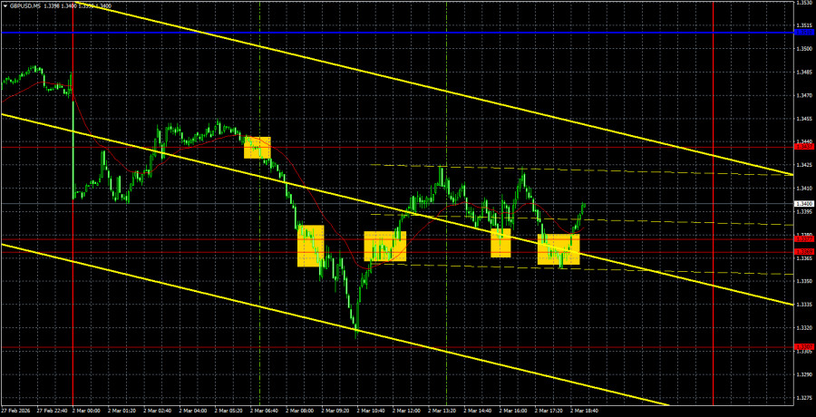 Валютная пара GBP/USD в течение понедельника также рухнула вниз, как камень, а фунт стерлингов продолжает полосу неудач. Напомним, что еще месяц назад британский фунт вместе с евровалютой мог возобновить восходящий тренд после небольшой коррекции. Однако Банк Англии принял пограничное, более «голубиное» решение на январском заседании, затем британский ВВП показал слабый результат, инфляция снизилась в январе сразу на 0,4% в годовом выражении, уровень безработицы вырос до 5,2%, а ожидания рынка по следующему заседанию БА стали на 100% «голубиными». Помимо этого, рынок труда США начал показывать признаки восстановления, уровень безработицы в Америке снижается два месяца подряд, а на все негативные отчеты из-за океана трейдеры попросту закрыли глаза. «Вишенкой на торте» стала полноценная война на Ближнем Востоке, что значительно повысило спрос на защитные активы, к коим доллар пока еще может себя причислять. В понедельник в Штатах был опубликован индекс деловой активности ISM в секторе производства. Значение индекса за февраль оказалось выше прогнозов, но рынок на этот важный отчет никакого внимание не обратил. Во второй половине дня фунт стерлингов уже достаточно активно восстанавливался, хотя это восстановление пока не делает ему погоды. Оно больше похоже на откат перед новым обвалом. К сожалению, сказать, сколько будет длиться реакция рынка на войну в Иране, вряд ли возможно, поэтому в ближайшее время рынок будет оставаться в состоянии шторма. Напомним, что на этой неделе еще и в США состоится ряд важных макроэкономических публикаций. На 5-минутном ТФ в понедельник было сформировано достаточно сигналов. Начался день с закрепления ниже уровня 1,3437, что позволяло трейдерам открывать шорты. Ближайший сигнал на покупку около области 1,3369-1,3377 призвал закрыть шорты и открыть лонги. Далее цена еще дважды отскочила от указанной области, каждый раз позволяя трейдерам открывать новые лонги. Ни одной убыточной сделки в течение дня быть не могло, но на 5-минутном ТФ хорошо видно, насколько сумбурными были движения.Советуем ознакомиться с другими статьями автора: