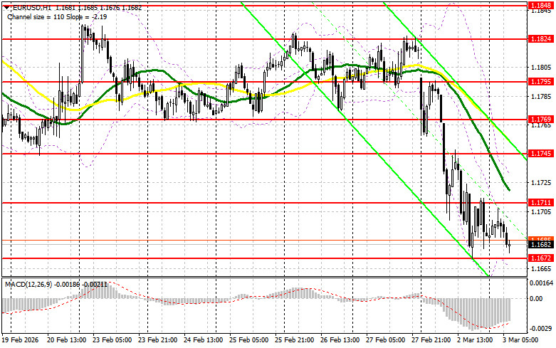 Вчера было образовано несколько точек входа в рынок. Давайте посмотрим на 5-минутный график и разберемся с тем, что там произошло. В своем утреннем прогнозе я обращал внимание на уровень 1.1697 и планировал от него принимать решения по входу в рынок. Снижение и формирование ложного пробоя в районе 1.1697 привели к точке входа на покупку евро, что вылилось в рост пары на 50 пунктов. Во второй половине дня активные действия быков в районе 1.1702 и 1.1672 также позволили утянуть с рынка по 25 пунктов на каждом тесте.Для открытия длинных позиций по EURUSD требуется:Прежде чем говорить о дальнейших перспективах движения EUR/USD давайте посмотрим, что происходило на фьючерсном рынке и как изменились позиции Commitment of Traders. В COT-отчете (Commitment of Traders) за 24 февраля наблюдалось сокращение длинных позиций и небольшой рост коротких. Но учитывая, что США начали войну с Ираном, в настоящее время этот отчет уже не имеет такой актуальности, какую мог бы иметь. Так что лучше всего сосредоточится на дальнейшем развитии конфликта на Ближнем востоке и покупках американского доллара против рисковых активов, в том числе и евро. В COT-отчете указано, что длинные некоммерческие позиции снизились на 16 676 до уровня 294 873, в то время как короткие некоммерческие позиции выросли на 948 до уровня 138 017. В результате спрэд между длинными и короткими позициями вырос на 3 662.Геополитический конфликт на Ближнем востоке, бомбардировки Ирана и хорошие данные по производственному индексу ISM США стали основными аргументами в пользу покупки американского доллара против евро. Сегодня в первой половине дня ожидаются данные по индексу потребительских цен еврозоны за февраль этого года и основному индексу потребительских цен. В случае снижения ценового давление падение европейской валюты продолжится. С учетом происходящего в мире, к покупкам евро сейчас нужно относиться с большой осторожностью. Первого проявления покупателей ожидаю увидеть в районе ближайшей поддержки 1.1672. Действовать там планирую только после формирования ложного пробоя, что даст точку входа в рынок с целью роста евро к сопротивлению 1.1711, образованному по итогам вчерашнего дня. Прорыв и обратный тест этого диапазона станут подтверждением правильных действий на покупку в расчете на более крупный рост пары к 1.1745. Самой дальней целью выступит область 1.1769, где буду фиксировать прибыль. При варианте снижения EUR/USD и отсутствия активности в районе 1.1672, давление на пару только увеличиться. Продавцы наверняка сумеют дотянуться до более интересного уровня 1.1634. Лишь формирование там ложного пробоя будет подходящим условием на покупку евро. Открывать длинные позиции сразу на отскок будут от 1.1607 с целью восходящей коррекции в 30-35 пунктов внутри дня.Для открытия коротких позиций по EURUSD требуется: Продавцы вчера не только сохранили контроль над рынком, но и добились новой крупной распродажи пары. В случае небольшой коррекции, первого проявления медведей ожидаю в районе сопротивления 1.1711. Лишь формирование там ложного пробоя будет поводом для продажи в расчете на снижение к поддержке 1.1672. Прорыв и закрепление ниже этого диапазона, а также обратный тест снизу вверх, станут еще одним подходящим вариантом на открытие коротких позиций с движением в район 1.1634, что усилит медвежий характер рынка. Самой дальней целью выступит область 1.1607, где