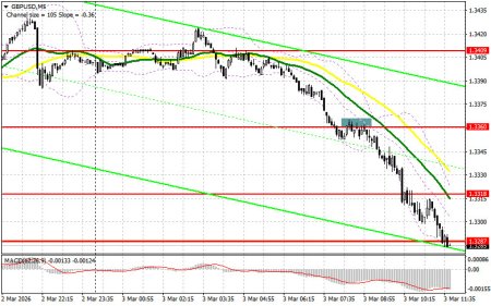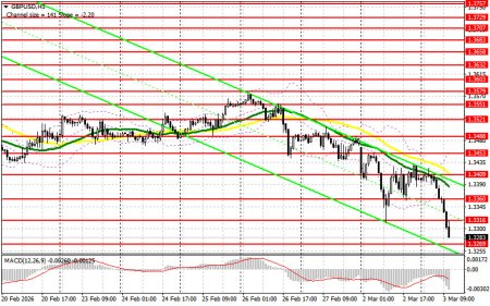 В своем утреннем прогнозе я обращал внимание на уровень 1.3360 и планировал от него принимать решения по входу в рынок. Давайте посмотрим на 5-минутный график и разберемся с тем, что там произошло. Прорыв и обратный тест 1.3360 привели к точке входа на продажу фунта, что вылилось в падение пары более чем на 70 пунктов. На вторую половину дня техническая картина была пересмотрена.Для открытия длинных позиций по GBP/USD требуется: Заявления Трампа о том, что война в Иране будет продолжаться столько, сколько нужно, спровоцировали очередные покупки доллара и падение британского фунта. Во второй половине дня все будут ждать выступлений представителей ФРС в лице Джона Уильямса и Нила Кашкари. Учитывая усилившиеся разговоры по поводу более поздних сроков снижения ставок в США из-за войны в Иране, комментарии представителей комитета по этому поводу будут сегодня очень востребованы. В случае дальнейшего снижения фунта первого проявления покупателей буду ждать лишь в районе поддержки 1.3269. Формирование там ложного пробоя даст точку входа в длинные позиции в расчете на небольшое восстановление к уровню 1.3316. Прорыв с обратным тестом сверху вниз этого диапазона приведут уже к новой точке входа в длинные позиции с перспективой выхода на 1.3360. Самой дальней целью окажется область 1.3409, где собираюсь фиксировать прибыль. При сценарии снижения GBP/USD и отсутствия активности со стороны быков на уровне 1.3269, давление на пару возрастёт, что приведет к новому крупному падению в минимума 1.3227. В таком случае лишь формирование там ложного пробоя будет подходящим условием на открытие длинных позиций. Покупать GBP/USD сразу на отскок собираюсь от поддержки 1.3206 с целью коррекции в 30-35 пунктов внутри дня.Для открытия коротких позиций по GBP/USD требуется:Продавцы продолжают контролировать рынок и в текущих условиях не исключены новые, куда более крупные движения пары вниз. Основной задачей медведей на вторую половину дня будет защита 1.3316. Формирование там ложного пробоя станет подтверждением правильной точки входа на продажу с целью снижения в район поддержки 1.3269. Прорыв и обратный тест снизу вверх этого диапазона на фоне жесткой позиции представителей ФРС приведут к сносу стоп-приказов, открыв путь к 1.3237, что усилит развитие медвежьего тренда. Там ожидаю более активного проявления крупных покупателей. Самой дальней целью выступит область 1.3206, где собираюсь фиксировать прибыль. Если спрос на фунт вернется во второй половине дня, а медведи не проявят себя в районе 1.3316, можно рассчитывать на более крупное восстановление пары. В таком случае продажи лучше всего отложить до теста сопротивления 1.3360. Открывать там короткие позиции буду только на ложном пробое. При отсутствии движения вниз и там, короткие позиции на отскок поищу в районе 1.3408, но лишь в расчете на коррекцию пары вниз на 30-35 пунктов внутри дня.Рекомендую ознакомиться:В COT-отчете (Commitment of Traders) за 24 февраля наблюдалось резкое сокращение коротких и длинных позиций. Очевидно, что такой дисбаланс сохранится и дальше – особенно с учетом того, что США развязали войну против Ирана, а власти Великобритании объявили о том, что также могут присоединиться к этому конфликту. В этих условиях целесообразнее сосредоточиться на эволюции ближневосточного конфликта и покупках доллара США в противовес рискованным активам, в 