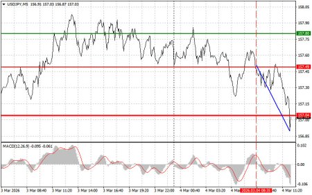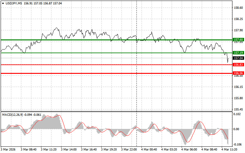 Разбор сделок и советы по торговле японской иенойТест цены 157.49 пришелся на момент, когда индикатор MACD только начинал движение вниз от нулевой отметки, что стало подтверждением правильной точки входа на продажу доллара. В результате пара снизилась в район целевого уровня 157.04.Далее ожидается публикация важной статистики: данных от ADP по динамике занятости в США за февраль и индекса деловой активности в сфере услуг от ISM. Эти индикаторы имеют решающее значение для формирования представлений о будущей монетарной политике Федеральной резервной системы. Позитивная тенденция в ADP может свидетельствовать о сохраняющейся устойчивости рынка труда, что, в свою очередь, повышает вероятность сохранения жесткого курса ФРС и может поспособствовать новой волне роста доллара. Индекс деловой активности в сфере услуг от ISM - значение индекса выше 50 пунктов говорит о расширении в секторе, тогда как падение ниже этой отметки указывает на его сокращение. Участники рынка будут анализировать не только общее значение индекса, но и его компоненты, в частности, субиндексы занятости и новых заказов, которые помогают прогнозировать дальнейшее развитие.Что касается внутридневной стратегии, то больше буду опираться на реализацию сценариев №1 и №2.Сигнал на покупкуСценарий №1: покупать USD/JPY сегодня планирую при достижении точки входа в районе 157.19 (зеленая линия на графике) с целью роста к уровню 157.60 (более толстая зеленая линия на графике). В районе 157.60 буду выходить из покупок и открывать продажи в обратную сторону (расчет на движение в 30-35 пунктов в обратную сторону от уровня). Рассчитывать на рост пары сегодня можно после сильных данных. Важно! Перед покупкой убедитесь в том, что индикатор MACD находится выше нулевой отметки и только начинает свой рост от нее.Сценарий №2: покупать USD/JPY сегодня также планирую в случае двух подряд тестов цены 156.83 в момент, когда индикатор MACD будет находиться в области перепроданности. Это ограничит нисходящий потенциал пары и приведет к обратному развороту рынка вверх. Можно ожидать рост к противоположным уровням 157.19 и 157.60.Сигнал на продажу Сценарий №1: продавать USD/JPY сегодня планирую после обновления уровня 156.83 (красная линия на графике), что приведет к быстрому снижению пары. Ключевой целью продавцов будет уровень 156.56, где буду выходить из продаж, а также открывать сразу покупки в обратную сторону (расчет на движение в 20-25 пунктов в обратную сторону от уровня). Давление на пару вернется в случае слабых отчетов. Важно! Перед продажей убедитесь в том, что индикатор MACD находится ниже нулевой отметки и только начинает свое снижение от нее. Сценарий №2: продавать USD/JPY сегодня также планирую в случае двух подряд тестов цены 157.19 в момент, когда индикатор MACD будет находиться в области перекупленности. Это ограничит восходящий потенциал пары и приведет к обратному развороту рынка вниз. Можно ожидать снижения к противоположному уровню 156.83 и 156.56.Что на графике:Тонкая зеленая линия – цена входа, по которой можно покупать торговый инструмент;Толстая зеленая линия – предположительная цена, где можно расставлять Take Profit или самостоятельно фиксировать прибыль, так как выше этого уровня дальнейший рост маловероятен;Тонкая красная линия – цена входа, по которой можно продавать торговый инструмент;Толстая красная линия – предполож