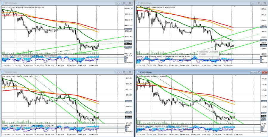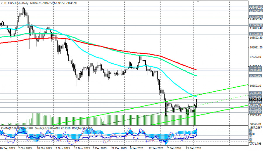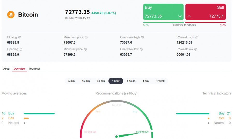 *) см. также: Торговые индикаторы InstaForex по BTC[/i] В начале марта 2026 года биткоин и криптовалютный рынок демонстрируют удивительную устойчивость, восстанавливаясь после обвала, вызванного эскалацией конфликта на Ближнем Востоке. В то время как традиционные рынки лихорадит, а доллар укрепляется до многомесячных максимумов, первая криптовалюта не только удержала ключевые уровни, но и поднялась выше 71000.00, возвращая свой статус «цифрового убежища» в периоды турбулентности. После совместных ударов США и Израиля по Ирану в минувшие выходные, в результате которых погиб верховный лидер аятолла Али Хаменеи, биткоин кратковременно падал до 65000.00. Однако уже к американской торговой сессии 4 марта курс восстановился до 72000.00, показав рост более 5% за день. На момент же публикации данной статьи, BTC/USD уверенно приближается к первому сильному уровню сопротивления 74000.00-74400.00 (ЕМА50 на дневном графике).Ключевые показатели