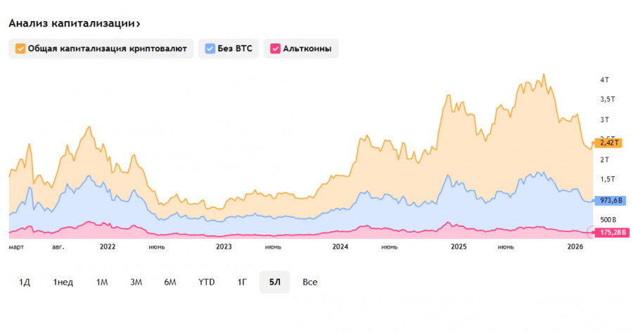 Общая капитализация рынка: 2,42 трлн, на 4,42% больше, чем вчера, по данным TradingView.