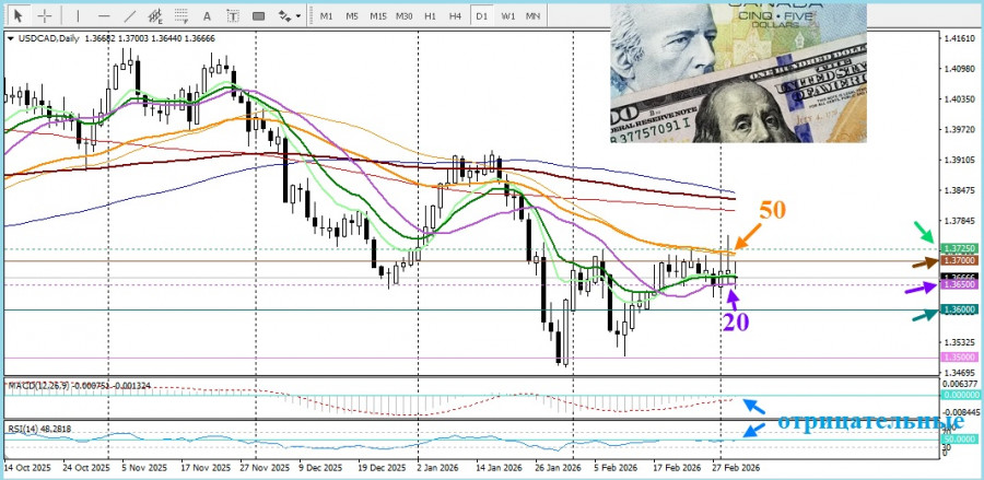 А с технической точки зрения осцилляторы на дневном графике ещё не перешли на положительную территорию, но цены торгуются выше 20-дневной SMA, оставляя шанс быкам. Дневное сопротивление пара встретила у круглого уровня 1,3700. Преодолев его, следующим станет 50-дневная SMA, вблизи уровня 0,3725. А поддержку пара нашла у 20- дневной SMA. Не удержав её, цены ускорят падение к круглому уровню 1,3600.В условиях смешанного фундаментального и технического фона участникам рынка лучше предпочесть дождаться более выраженного сигнала покупок, прежде чем открывать новые длинные позиции по паре USD/CAD.