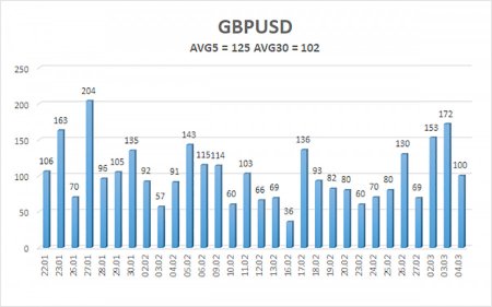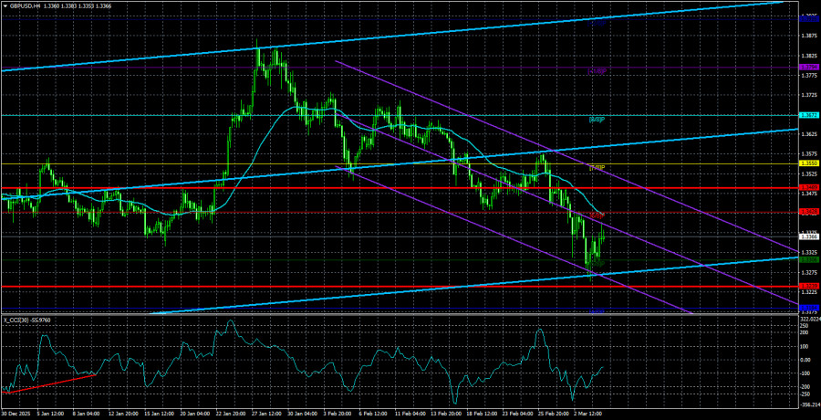 Валютная пара GBP/USD сохраняет нисходящую тенденцию на 4-часовом ТФ, а в среду немного скорректировалась против последнего обвала. Честно говоря, фунт стерлингов хочется назвать главным неудачником начала 2026 года, несмотря на то, что в январе-месяце он обновил свой четырехлетний максимум. Однако затем буквально в течение месяца британская валюта потеряла уже около 500 пунктов. И можно даже сказать, что вполне заслуженно. Началось все с тогда еще возможного конфликта в Иране, а также заседания Банка Англии, на котором было принято решение сохранить ставку на прежнем уровне, но в то же время решение оказалось «пограничным», на что рынок не рассчитывал. С тех пор фунт только падает, а из Великобритании поступила целая серия данных, которая лишь убеждала трейдеров в том, что Банк Англии перейдет к смягчению уже на следующем заседании. Напомним, что уровень безработицы вырос, инфляция замедлилась до 3%, а темпы роста ВВП остаются мизерными. Таким образом, может показаться, что британский фунт падал абсолютно закономерно все это время. Финальный обвал начался на прошлой неделе в четверг, когда переговоры между Ираном и США в Женеве провалились. Еще тогда мы говорили, что война между Ираном и США неизбежна, но в то же время рынок готовился к ней, как минимум, две недели. Почему же тогда доллар продолжил расти? Потому что никто в мире не ожидал, что Иран будет отвечать настолько сильно и масштабно. В первые же дни противостояния выяснилось, что у Ирана достаточно ракет и для американских кораблей в Персидском заливе, и для Израиля, и для Катара, и для всех союзников США в регионе. Таким образом, союзники США бомбят Иран, а Иран вместо того, чтобы рухнуть, бомбит всех, кто атакует его. Лидеры в Иране меняются уже примерно после каждого американского обстрела, но сам факт того, что на сцену выходят новые «первые лица» страны и заявляют о сохранении политического курса, о многом говорит. Проще говоря, Иран готов воевать до последнего иранца. А население Ирана составляет больше 80 млн человек. Сама страна занимает 17 место в мире по размеру территории. И эта территория крайне сложна для проведения наземной операции. Таким образом, первые несколько дней войны показали, что бомбить союзники Трампа Иран могут сколько угодно, от этого мало что поменяется. Кстати, сам Трамп уже несколько раз пытался добиться размещения военных баз в странах Евросоюза. Угадайте куда бы полетели следующие иранские ракеты, если бы Великобритания или Испания позволили Трампу разместить американские войска на их территории? Но может быть этого Трамп и хочет? Вовлечь в конфликт как можно большее количество стран, чтобы не только Америка воевала против Ирана? Звучит довольно правдиво, учитывая методы президента-республиканца. Кстати, госдолг США всего за несколько дней военных действий увеличился на 100 млрд $. На наш взгляд, доллар может оставаться главным бенефициаром войны в Иране некоторое время, но его будущее остается туманным и мрачным. Средняя волатильность пары GBP/USD за последние 5 торговых дней составляет 125 пунктов. Для пары фунт/доллар это значение является «средним». В четверг, 5 марта, таким образом, мы ожидаем движения внутри диапазона, ограниченного уровнями 1,3239 и 1,3489. Старший канал линейной регрессии направлен вверх, что указывает на восстановление тренда. Индикато