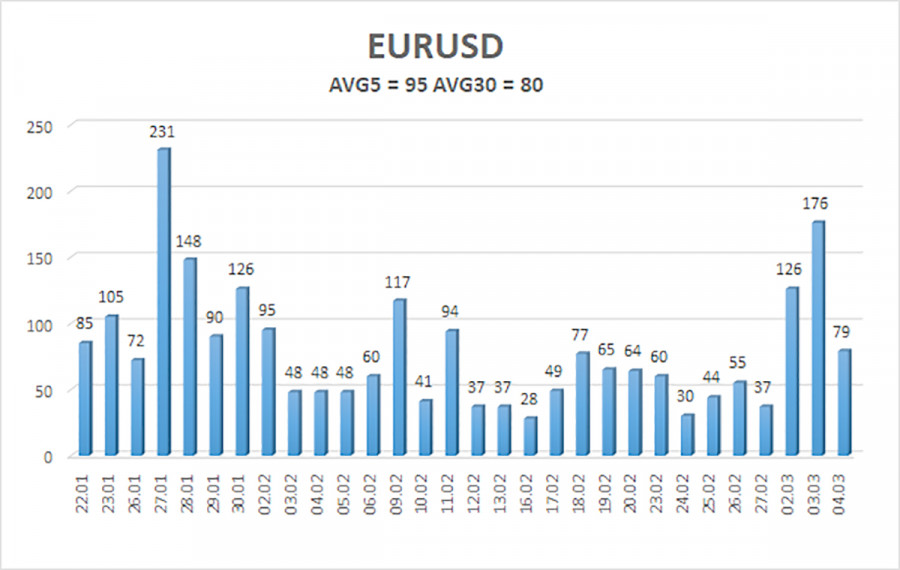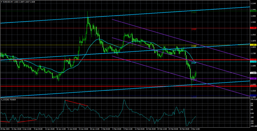 Валютная пара EUR/USD в течение среды прекратила свободное падение и даже немного скорректировалась. Конечно, сейчас еще слишком рано делать вывод о завершении «долларового тренда», так как он всецело зависит от ситуации на Ближнем Востоке. Однако мы все же хотим отметить простую логическую цепочку, которая выражается вопросом «Что, если война в Иране будет длиться месяц или даже год?». Все это время доллар будет дорожать? Вряд ли. Мы считаем, что на подобного рода и масштаба события рынок реагирует экспрессивно и эмоционально лишь в самом начале, а затем забывает о них. К примеру, война между Украиной и Россией длиться уже пятый год, но доллар же не растет на фоне сохраняющегося геополитического конфликта в Восточной Европе! Точно такая же судьба ждет и конфликт на Ближнем Востоке. Может быть, доллар еще будет тяготеть к росту неделю или даже две. Дело в том, что Иран начал наносить удары не только по американским военным кораблям, находящимся в Персидском заливе, или по Израилю. Он наносит ракетные удары по всем американским базам, до которых могут долететь его ракеты. А это и Турция, и даже Кипр. Вряд ли в Греции или в Турции рады такому стечению обстоятельств, даже если удары были нанесены исключительно по американским военным базам. Таким образом, в самое ближайшее время Иран может подвергнуться жесткой бомбардировке не только со стороны Израиля и США, а также ближайших в регионе союзников Америки. Он может подвергнуться даже ударам Турции, которая также является членом НАТО. Конечно, новая эскалация конфликта на Ближнем Востоке может еще больше усилить потребность инвесторов в защитном активе. Таком, как доллар. Однако мы все же считаем, что первый шок остался позади, и дальше, если доллар и будет дорожать, то уже не такими темпами, как в понедельник и вторник. Рынок потихоньку переключит свое внимание на экономические события, а здесь доллару есть чего опасаться. Напомним, что американская экономика продемонстрировала замедление в четвертом квартале. В целом же она растет темпами ниже, чем при Джо Байдене. Таким образом, «золотой век» Трампа пока не отражается в реальных макроэкономических показателях. Инфляция замедлилась до 2,4%, что дает возможность ФРС в самое ближайшее время перейти к смягчению монетарной политики. Энергетический кризис в первую очередь касается Европы, но не США. В Америке достаточно своей сланцевой нефти, а главная проблема американцев – это Трамп, а не рост цен на бензин и газ. Таким образом, в данное время мы не видим достаточно количества оснований для продолжения роста американской валюты. Признаем, мы не рассчитывали, что доллар покажет такой сильный рост в феврале-марте, но и масштабы войны на Ближнем Востоке тоже никто не мог предсказать заранее. Все считали, что это будет военная операция с ликвидацией ключевых лидеров Ирана и второй попыткой уничтожить ядерные объекты страны. На практике, как это часто бывает, вышло иначе. Средняя волатильность валютной пары EUR/USD за последние 5 торговых дней по состоянию на 5 марта составляет 95 пунктов и характеризуется, как «средняя». Мы ожидаем движение пары между уровнями 1,1543 и 1,1733 в четверг. Старший канал линейной регрессии направлен вверх, что указывает на сохранение восходящего тренда. Индикатор CCI вновь заходил в область перепроданности, что предупрежда