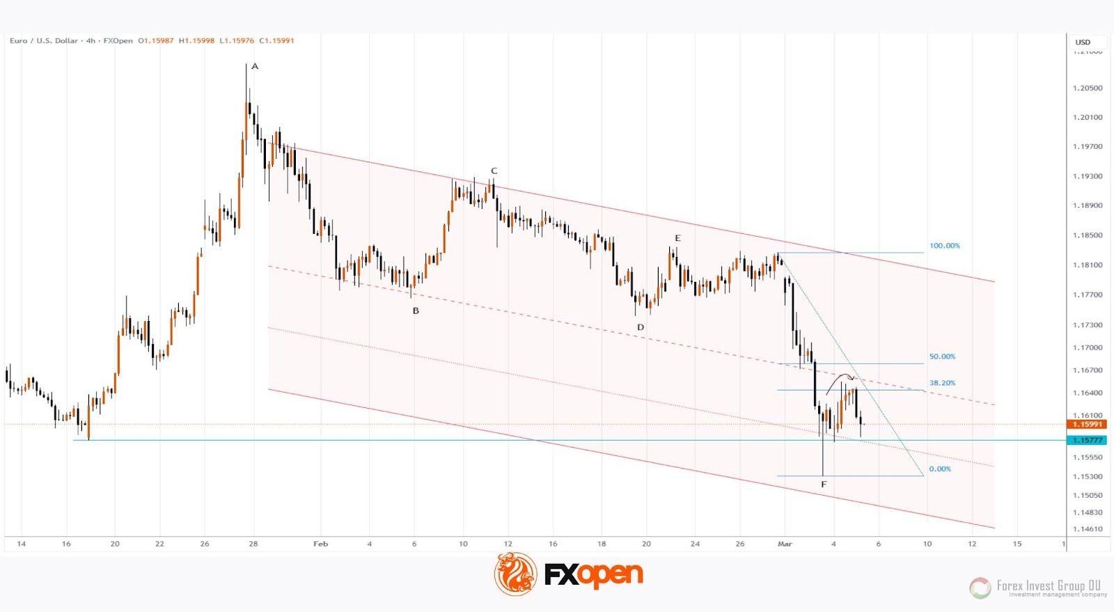 С того времени развитие нисходящей динамики привело к формированию последовательности А-В-С-D-E-F. Теперь, анализируя ключевые паттерны на графике курса EUR/USD, мы можем построить нисходящий канал.