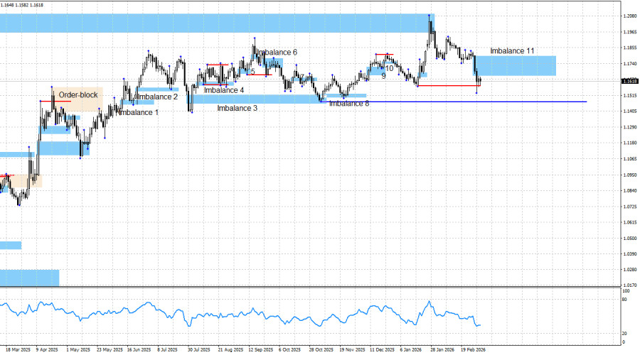 На этой неделе, как и предполагалось, был образован «медвежий» имбаланс 11. Однако тренд все еще остается «бычьим», а вторник завершился съемом ликвидности со свинга от 19 января. Напомню, что съем ликвидности не является паттерном, от которого можно открывать позиции. Он является лишь предупреждением о возможной смене настроения на рынке. Таким образом, перед трейдерами стоит выбор: либо ждать на «бычьем» тренде «медвежьи» сигнал, либо ждать слом «бычьего» тренда и уже тогда работать по «медвежьим» паттернам, либо ждать «бычьих» паттернов. Графическая картина пока продолжает сигнализировать о «бычьей» доминации. «Бычий» тренд сохраняется, однако в данное время «бычий» вариант развития событий отложен на неопределенное время. Чтобы вновь рассчитывать на рост европейской валюты, требуются новые «бычьи» паттерны. Информационный фон в четверг был крайне слабым, поэтому и активность трейдеров была низкой. Единственный интересный отчет по розничной торговле в Евросоюзе показал сокращение в объемах на 0,1% в январе, хотя трейдеры, как полагается, ожидали более высокого значения. Однако европейская экономика уже очень давно не радует своими показателями. Ситуация может еще больше ухудшиться, если конфликт в Иране не удастся потушить в ближайшее время. В этом случае Евросоюз столкнется с полноценным энергетическим кризисом, новым ростом инфляции. Если же Европа примет решение не только предоставлять свои базы для дальнейших атак союзниками по Ирану, а самой участвовать в войне, то экономика очень быстро полетит вниз. Причин у быков в последние месяцы атаковать было огромное количество, и даже с началом войны на Ближнем Востоке их меньше не стало. Структурно и глобально политика Трампа, которая привела к серьезному падению доллара в прошлом году, не поменялась. В ближайшее время американская валюта может демонстрировать рост на фоне бегства инвесторов от риска, но этот фактор не сможет оказывать ей поддержку долго. А вот «голубиные» перспективы ДКП FOMC, торговую войну Трампа со всем миром, слабость американского рынка труда, два «шатдауна», военную агрессию США, уголовное преследование Пауэлла, падение темпов роста ВВП и другие не очень приятные для Америки вещи конфликт в Иране не отменяет. В «медвежий» тренд я по-прежнему не верю. Доллар получил временную поддержку рынка, но далеко не факт, что такая ситуация будет сохраняться долгое время. Синяя линия показывает ценовой уровень, ниже которого можно будет считать «бычий» тренд завершенным. До него медведям нужно пройти вниз около 140 пипсов, и даже если с этой задачей медведи справятся, я буду сомневаться в «медвежьем» тренде. На мой взгляд, пара демонстрирует сильное падение только на факторе геополитики. Когда он перестанет действовать, за счет чего будут атаковать медведи? «Медвежьи» паттерны могут быть образованы на этой неделе, и тогда локальную картину будет проще анализировать и строить прогнозы. Календарь новостей для США и Евросоюза: Евросоюз – Выступление президента ЕЦБ Кристин Лагард (10-00 UTC). Евросоюз – Изменение объема ВВП в четвертом квартале (10-00 UTC). США – Nonfarm Payrolls (13-30 UTC). США – Уровень безработицы (13-30 UTC). США – Изменение объемов розничной торговли (13-30 UTC). США – Изменение средней почасовой заработной платы (13-30 UTC). 6 марта календарь экономических событий содерж