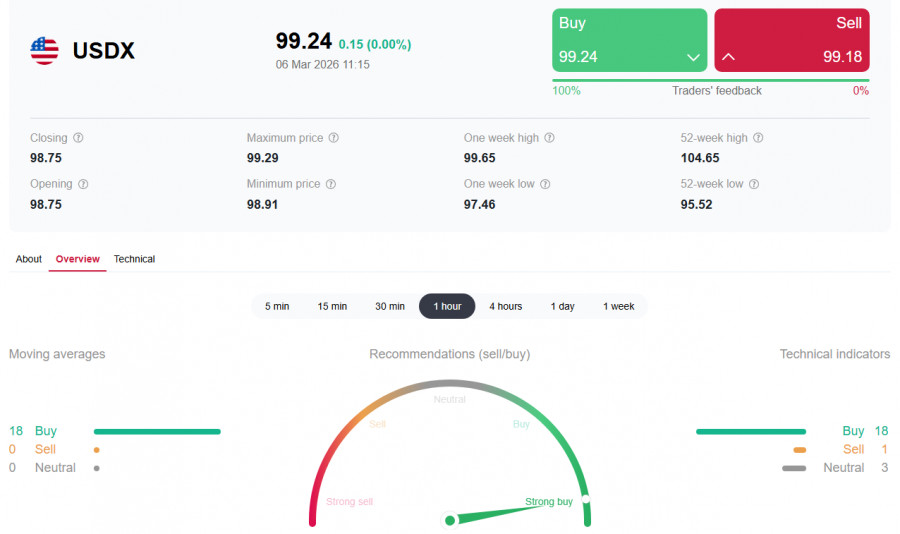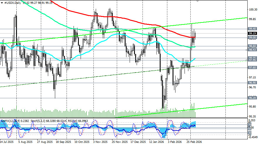 * см. также: Торговые индикаторы InstaForex по USDX[/i] Доллар вновь перешел к росту в начале европейской торговой сессии пятницы, завершая пятую неделю геополитического кризиса в состоянии повышенной волатильности и балансируя в районе 98.90–99.20 после рывка к пятинедельному максимуму 99.30. Американская валюта оказалась в эпицентре столкновения противоположных сил: с одной стороны — беспрецедентный спрос на безопасные активы на фоне расширения ближневосточного конфликта, с другой — растущие ожидания деэскалации и фундаментальная переоценка перспектив монетарной политики ФРС. Между тем, внимание инвесторов смещается на публикацию сегодня (в 13:30 GMT) отчёта Минтруда США с данными за февраль. Он станет ключевым тестом для определения ближайшей траектории доллара. Текущая ситуация: геополитика правит бал Доллар как главная «тихая гавань» Война США и Израиля с Ираном, вошедшая в седьмой день, продолжает доминировать над настроениями рынков. Иран нанес ракетные удары по нефтеперерабатывающему заводу в Бахрейне, а США приостановили операции в своем посольстве в Кувейте. Президент Трамп заявил, что иранские чиновники пытались достичь соглашения о прекращении войны, но уже «слишком поздно», и США стремятся к уничтожению Ирана. На этом фоне доллар укрепился примерно на 1,5% с начала конфликта, во многом за счет закрытия коротких позиций, а индекс USDX 3 марта приблизился к отметке 99.65 против 97.62 в конце февраля. Экономисты подчеркивают уникальное положение США: страна является нетто-экспортером энергии с 2019 года и крупнейшим экспортером СПГ в мире с начала 2026 года, что делает доллар более устойчивым по сравнению с валютами стран-импортеров энергоресурсов. Дипломатические сигналы охлаждают пыл Однако 4 марта доллар показал самое резкое падение почти за месяц после сообщений СМИ о том, что представители Ирана предложили обсудить условия прекращения войны. Индекс USDX ослабел на 0,8% от достигнутого накануне «хая», закрыв этот торговый день на отметке 98.78, хотя в последующие два дня частично отыграл падение, вернувшись к зоне 99.20-99.30. Иран официально опроверг какую-либо коммуникацию с ЦРУ, но сам факт обсуждения возможности переговоров снизил градус напряженности. Надежды на деэскалацию также подогреваются слухами о готовности Ирана отказаться от ядерных амбиций при выгодном предложении США. В результате нефть скорректировалась от максимумов, а доллар лишился части «военной премии». Фундаментальная поддержка: макростатистика Несмотря на геополитическую неопределенность, американская экономика продолжает демонстрировать устойчивость. Индекс деловой активности в сфере услуг (ISM Services PMI) взлетел до 56,1 в феврале — максимального значения с 2022 года. Компонент занятости также оказался сильным, а отчет ADP показал рост занятости в частном секторе на 63 тыс. при прогнозе в 50 тыс. Эти данные создают важный разогрев перед сегодняшним отчетом NFP и подтверждают, что рынок труда остается здоровым. Фактор ФРС: ястребиный разворот, внутренние разногласия, пауза Эскалация конфликта и рост цен на энергоносители возобновили опасения по поводу инфляции. Согласно инструменту CME FedWatch, вероятность того, что ФРС оставит ставку без изменений на следующих трех заседаниях, возросла до почти 70% с примерно 50% до начала войны. Инвесторы теперь закладывают следующее сниж