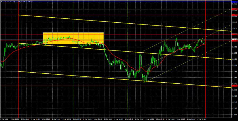 Валютная пара EUR/USD в течение пятницы продолжала торговаться в ценовом диапазоне, ограниченном уровень 1,1542 и областью 1,1657-1,1666. Это не флэт, это временная пауза перед новым движением. По сути, на прошлой неделе рынок лишь два дня отрабатывал события на Ближнем Востоке, а в остальные три дня ждал развития события, не забывая игнорировать многие макроэкономические данные. Рынок ждет, состоится ли эскалация войны на Ближнем Востоке, ожидает вступления или невступления других государств в открытый конфликт, ожидает решения Дональда Трампа о проведении наземной операции в Иране. Если ситуация в регионе будет становится более напряженной, американская валюта может возобновить рост. Однако трейдерам важно понимать, что рынок сейчас скупает доллар не потому, что война в Иране окажет благотворное влияние на экономику США или же позволит Америке решить геополитические вопросы, которые затем позитивно отразятся на стране. По сути, мы видим войну, которую начал главный «миротворец» современности Дональд Трамп, решая собственные задачи. Напомним, что Конгресс США не принимал решения о нападении на Иран или Венесуэлу, но кого в Белом Доме сейчас интересует мнение Конгресса? Доллар растет только потому, что инвесторы бегут из рисковых активов, и им попросту нужно куда-то переводить свои капиталы. Таким образом, рост американской валюты не имеет под собой четкого фундамента. На 5-минутном ТФ в пятницу был сформирован один торговый сигнал. На европейской торговой сессии пара отскочила от области 1,1615-1,1625, что привело к падению практически до уровня 1,1542. К сожалению, для отработки этого уровня не хватило всего 5 пунктов, но трейдеры все равно могли закрыть сделку вручную и получить хорошую прибыль. К концу дня цена вернулась в область 1,1615-1,1625, но новых сигналов сформировано уже не было.Советуем ознакомиться с другими статьями автора: