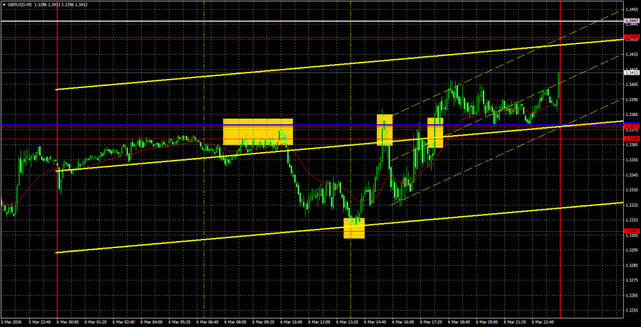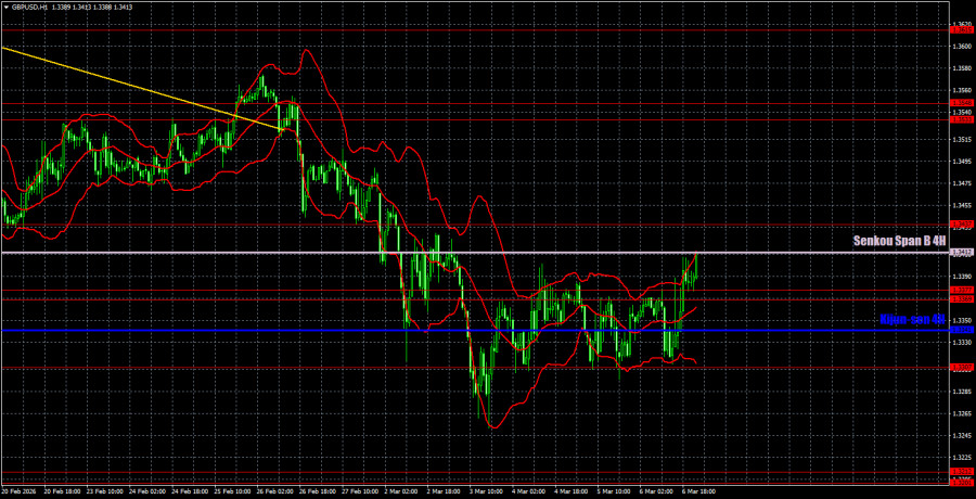 Валютная пара GBP/USD в течение пятницы все-таки показала восходящее движение. Со скрипом, с большим трудом, хотя макроэкономический фон предполагал падение доллара. Рынок проснулся только ближе к закрытию рынка на выходные, а пара GBP/USD сумела подняться к линии Сенкоу Спан Б. Таким образом, если эта линия будет преодолена в начале новой недели, фунт стерлингов впервые за полтора месяца может сформировать некое подобие восходящей тенденции. Если случится отскок от линии Сенкоу Спан Б или геополитический конфликт на Ближнем Востоке начнет набирать еще большие обороты, падение пары возобновится очень быстро. Напомним, что последняя статистика из-за океана не предвещает ничего хорошего ни для американской экономики, ни для американского доллара. Инфляция в последние месяцы замедлялась, что приближает ФРС к новому смягчению монетарной политики. В то же время война в Иране уже сейчас подняла цены на энергоносители в мире чуть ли не в два раза, поэтому эксперты ждут нового роста инфляции. А ФРС все равно может возобновить смягчение политики, потому что, как показали февральские данные, рынок труда не восстанавливается после прекрасного первого года правления Трампа, а экономика США в четвертом квартале снизилась до темпов роста +1,4%. На 5-минутном ТФ в пятницу было сформировано несколько достаточно неплохих торговых сигналов. Сначала пара отскочила от области 1,3369-1,3377, что позволяло открывать трейдерам короткие позиции. В начале американской сессии с погрешностью в 3 пункта был отработан уровень 1,3307, поэтому сделки на продажу можно было закрыть в прибыли и открыть длинные позиции. Уже через час цена вернулась к области 1,3369-1,3377, позволив закрыть лонги также в прибыли, и сформировала еще один сигнал на продажу. А под занавес недели – еще один сигнал на покупку. Последние два сигнала прибыли не принесли, но и убытка тоже.Советуем ознакомиться с другими статьями автора: