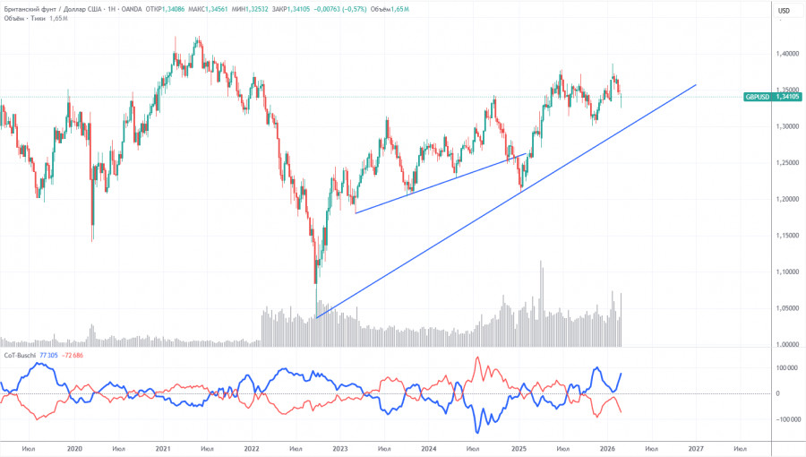 Отчеты COT по британскому фунту показывают, что в последние годы настроение коммерческих трейдеров постоянно меняется. Красная и синяя линии, отображающие нетто-позиции коммерческих и некоммерческих трейдеров, постоянно пересекаются и в большинстве случаев находятся недалеко от нулевой отметки. В данное время линии отдаляются друг от друга, а доминируют по-прежнему некоммерческие трейдеры с... продажами. В последнее время спекулянты активно наращивали длинные позиции, однако так и не смогли перейти в зону собственного превосходства. Доллар продолжает снижаться из-за политики Дональда Трампа, что отлично видно на недельном ТФ(иллюстрация выше). Торговая война будет продолжаться в том или ином виде еще долгое время, а ФРС в любом случае будет снижать ставку в ближайшие 12 месяцев. Спрос на доллар так или иначе будет падать. Согласно последнему отчету COT(от 3 марта) по британскому фунту, группа «Non-commercial» закрыла 7,7 тысячи контрактов BUY и открыла 7,9 тысячи контрактов SELL. Таким образом, нетто-позиция некоммерческих трейдеров уменьшилась за неделю на еще 15,6 тысячи контрактов. В 2025 году фунт довольно сильно вырос, но следует понимать, что причина одна – политика Дональда Трампа. Как только эта причина будет нивелирована, доллар может перейти в рост. Но когда это произойдет – не знает никто.Анализ GBP/USD 1Н.