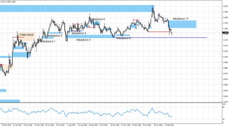 Пара EUR/USD в первый день недели опустилась еще немного, и все больше отдаляется от единственного рабочего паттерна – имбаланса 11, а также становится все ближе к слому «бычьего» тренда. Синяя линия на графике обозначает уровень, ниже которого «бычий» тренд, вероятнее всего, будет считаться завершенным. Нельзя полностью исключать вероятность долгосрочного боковика, так как все движения с июля прошлого года легко при желании можно рассматривать, как боковик с небольшим восходящим уклоном. Также нельзя исключать вариант съема ликвидности с лоу от 4 ноября и 31 июля прошлого года, после чего рост европейской валюты будет возобновлен. Таким образом, возможных вариантов развития события сейчас предостаточно. Не хватает только понимания, какой из них будет реализован и сигналов для трейдеров. Трейдеры по-прежнему торгуют исключительно на событиях, связанных с войной в Иране и ценами на энергоносители. Сегодня нефть показала рост почти до 120$, а некоторые эксперты считают, что в случае продолжения войны на Ближнем Востоке черное золото может подскочить и до 215$ за баррель. Таким образом, в ближайшее время мы можем еще не один раз увидеть атаки медведей. Но можем и не увидеть ни одной, если ситуация на Ближнем Востоке начнет потихоньку налаживаться. Или хотя бы не становится еще хуже.