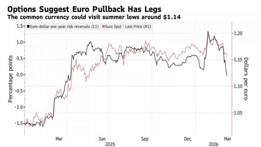 Взлет нефти выше $110 за баррель стал смертным приговором для евро. Как отмечает ANZ, EUR/USD традиционно чутко реагирует на шоки рынка черного золота. Четыре года назад из-за вооруженного конфликта на Украине региональная валюта рухнула ниже паритета. Тогда речь шла о вытеснении с рынка крупнейшего производителя с объемом добычи около 10 млн б/с. Сейчас – о перекрытии основного маршрута Brent с Ближнего Востока в Европу и Азию. И это по оценкам JP Morgan, также может стоить мировой экономике недостатка предложения в 10 млн б/с. Еврозона является нетто-импортером энергетических товаров, резкий взлет нефти и газа может оставить ее экономику без штанов. Неудивительно, что недельные риски разворота по евро упали до минимальных уровней со времен COVID-19, президентских выборов в США и во Франции. Тогда речь шла о всплесках геополитической напряженности. Нынче она достигает новых немыслимо высоких уровней. Динамика рисков разворота по евро