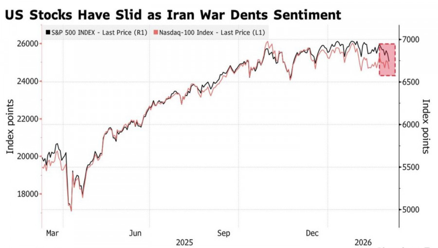 Конфликт на Ближнем Востоке изменил настроения на срочном рынке не только в разных временных периодах. Если ранее считалось, что текущее падение EUR/USD – не более чем коррекция к восходящему тренду, то в начале весны все перевернулось с ног на голову. Годовые риски разворота по евро опустились до самого дна с тех пор, как Фридрих Мерц огорошил Европу фискальными стимулами. «Бычья» тенденция по основной валютной паре развернулась? Беда не приходит в одиночку. Возглавляемый канцлером Германии Христианско-демократический союз проиграл местные выборы в Баден-Вюртемберг. Хотя рейтинги показывали преимущества партии власти над победившими Зелеными. Это обстоятельство подлило масла в огонь пике EUR/USD. Однако главной причиной падения евро является нависшая над мировой экономикой угроза стагфляции. Если цены на нефть действительно поднимутся до $150 за баррель, как прогнозирует Катар, инфляция резко вырастет, а глобальный ВВП резко замедлится. При таком раскладе глобальный аппетит к риску упадет и потянет за собой вниз американские фондовые индексы. Динамика фондовых индексов США