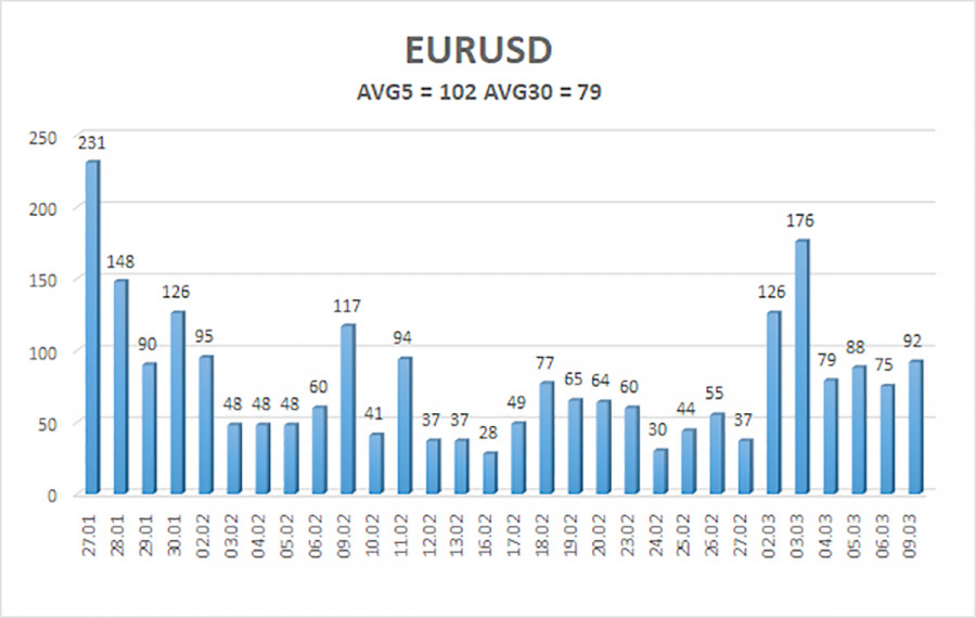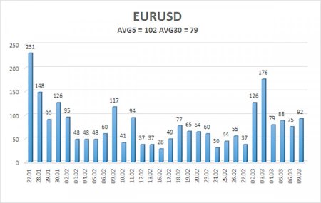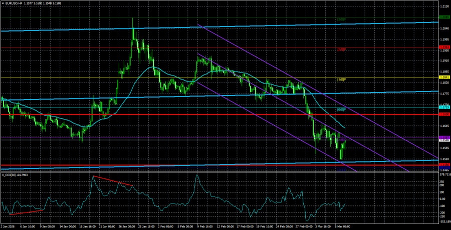 Валютная пара EUR/USD в течение понедельника пережила новый инфаркт. Если быть точнее, то пережили его инвесторы, трейдеры, банки, компании и правительства. Одним словом – весь мир. Нефть марки Brent на утренних торгах поднялась до отметки 119$, что стало следствие очередной серии ударов по нефтеперерабатывающим заводам, хранилищам и распределительным объектам. Как видим, война в регионе Персидского залива идет на уничтожение энергетической инфраструктуры. И в этом ее странность. Напомним, что Дональд Трамп начал полномасштабную войну с целью уничтожения запасов урана в Иране, а также лишения возможности Тегерана даже гипотетически наносить удары баллистическими ракетами по территории США. Параллельно с этим Трамп хотел бы добиться смены правительства Ирана на более лояльное к Америке, так как президент США отлично понимает – каждой следующее правительство будет придерживаться той же самой политики, что и предыдущее. За последнюю неделю в Иране были убиты около 50 высокопоставленных чиновников, в том числе – Али Хаменеи, верховный аятолла. И политика Ирана абсолютно не изменилась. Однако в данное время союзники США работают не над уничтожением запасов урана. Они работают над уничтожением запасов нефти. А точнее – производственных мощностей в нефтяной отрасли. И возникает один простой и до боли знакомый вопрос: а не заключается ли главная цель как раз в нефти, а не в уране? Америка готова делиться своими нефтяными и газовыми запасами со всем миром. Однако в прошлом году многие страны приходилось принуждать к закупкам американской нефти и газа. А теперь, когда многие объекты нефтяной инфраструктуры на Ближнем Востоке уничтожены, Ормузский пролив заблокирован, поставки нефти из региона остановлены, нефть взлетела в цене, кто является бенефициаром этой ситуации? Те страны, которые сами добывают нефть и продают ее. То есть США, Россия, подконтрольная Вашингтону Венесуэла. Конечно, весьма сложно понять, чего на самом деле добивается Дональд Трамп. Вполне возможно, что война в Иране – это не только про иранскую ядерную угрозу или про нефть, что лежит на плаву. Дело в том, что главным импортером нефти из Венесуэлы и Ирана всегда был Китай. Может быть, в Китае и заключается вся суть конфликта? Вполне возможно, что таким изощренным способом Трамп старается потушить промышленный прогресс и экономический рост Пекина, который он считает главным врагом США. Но какой в этом смысл, если Китай легко и просто может закупать нефть и газ в России? В общем, как всегда, имеется версия для широких масс, а имеется истинная версия. О второй знают наверняка очень немногие лица на планете, а остальные – могут лишь догадываться. Так или иначе, доллар в последние несколько дней растет уже гораздо более слабыми темпами, практически не растет. Это говорит нам о том, что основную часть реакции на войну на Ближнем Востоке мы уже увидели. Средняя волатильность валютной пары EUR/USD за последние 5 торговых дней по состоянию на 10 марта составляет 102 пункта и характеризуется, как «высокая». Мы ожидаем движение пары между уровнями 1,1486 и 1,1690 во вторник. Старший канал линейной регрессии направлен вверх, что указывает на сохранение восходящего тренда. Индикатор CCI вновь заходил в область перепроданности, что предупреждает о возобновлении восходящего тренда. Также сформиро