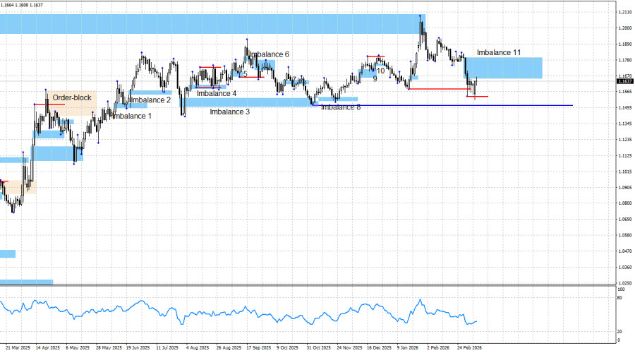 На мой взгляд, без новой эскалации конфликта на Ближнем Востоке доллару будет крайне сложно продолжить рост, а медведям – продолжать наступление. Хочу напомнить, что на прошлой неделе трейдеры проигнорировали важные данные по рынку труда и безработице в США, а ранее – отчет по ВВП за четвертый квартал. А ведь это данные, которые должны были отправить американскую валюту в нокаут. Вчера Трамп заговорил о возможном завершении войны в ближайшее время, и такая мирная риторика должна успокоить рынок нефти и газа. Снятии санкций с России даст многим странам замену энергоносителей с Ближнего Востока. И самое главное – Трамп рассчитывал на блицкриг в Иране, а получил – потенциально затяжной конфликт. На мой взгляд, президент США не пойдет на многомесячную войну с Ираном. На прошлой неделе, как и предполагалось, был образован «медвежий» имбаланс 11, а на этой неделе он отработан. Полная отработка и реакция цены на этот паттерн может занять достаточно много времени, однако тренд все еще остается «бычьим», поэтому перед открытием сделок на продажу следует дважды подумать. В любом случае сигнал на продажу пока еще не образовался. А может быть и не будет образован. Графическая картина пока продолжает сигнализировать о «бычьей» доминации. «Бычий» тренд сохраняется, однако в данное время трейдеры-быки не имеют достаточно причин для нового наступления. Чтобы ожидать рост европейской валюты, война в Иране должна пойти на спад, цена на нефть и газ должна продолжать снижаться. Чтобы открывать новые сделки на покупку, нужны новые «бычьи» паттерны или хотя бы съем ликвидности с двух последних «медвежьих» свингов. Информационный фон во вторник был достаточно скудным, но напомню, что в прошлую пятницу трейдеры проигнорировали отчеты Nonfarm Payrolls и уровень безработицы. Таким образом, сейчас неважно, имеются ли важные публикации в течение дня. Пара движется под влиянием совершенно других факторов – геополитических и энергетических. Причин у быков в последние месяцы атаковать было огромное количество, и даже с началом войны на Ближнем Востоке их меньше не стало. Структурно и глобально политика Трампа, которая привела к серьезному падению доллара в прошлом году, не поменялась. В ближайшее время американская валюта может демонстрировать рост на фоне бегства инвесторов от риска, но этот фактор не сможет оказывать ей поддержку постоянно. А вот «голубиные» перспективы ДКП FOMC, торговую войну Трампа со всем миром, слабость американского рынка труда, два «шатдауна», военную агрессию США, уголовное преследование Пауэлла, падение темпов роста ВВП и другие не очень приятные для Америки вещи конфликт в Иране не отменяет. В «медвежий» тренд я по-прежнему не верю. Доллар получил временную поддержку рынка, но не факт, что такая ситуация будет сохраняться долгое время. Синяя линия показывает ценовой уровень, ниже которого можно будет считать «бычий» тренд завершенным. До него медведям нужно пройти вниз около 90 пипсов, и даже если с этой задачей медведи справятся, я все равно буду сомневаться в «медвежьем» тренде. На мой взгляд, пара демонстрирует сильное падение только на факторе геополитики. Когда он перестанет действовать, за счет чего будут атаковать медведи? Календарь новостей для США и Евросоюза: Евросоюз – Индекс потребительских цен в Германии (07-00 UTC). США