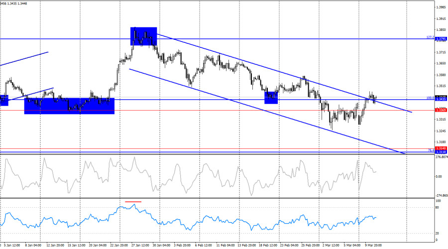 Ситуация с волнами продолжает меняться на «бычью». Последняя завершенная волна вниз не пробила предыдущий лоу, а новая волна вверх пробила предыдущий пик. Таким образом, мы начинает наблюдать первые зачатки «бычьего» тренда. Информационный фон для британца был слаб в последние месяцы, а геополитика обеспечивала медведям полное преимущество на рынке. Однако война в Иране может завершиться в скором времени, а Ормузский пролив – разблокирован американскими военными кораблями. Информационный фон во вторник был слаб, но трейдеры-быки продолжали атаковать на фоне снижения напряжения на Ближнем Востоке. Безусловно, говорить о завершении конфликта сейчас не время. Я считаю, что он может из фазы активных боевых действий перетечь в вялотекущую фазу, которая будет длиться годами. Однако рынкам нужны хотя бы какие-то позитивные новости. И первые из них поддержали рисковые валюты и активы. Трейдеры перестали скупать доллар, как безопасный актив, а тренд начал меняться на «бычий». Теперь быкам важно не растерять преимущество. Сегодня в Америке выйдет отчет по инфляции. Прогнозы – достаточно нейтральные. Основной показатель в феврале должен остаться на уровне 2,4%, базовый – на уровне 2,5%. Если эти цифры подтвердятся, трейдеры вряд ли отреагируют на этот отчет. Если инфляция хоть немного ускорится, медведи могут вновь перейти в атаку. Напомню, что на фоне роста цен на энергоносители во всем мире ожидается ускорение инфляции. Таким образом, если в Америке инфляция вновь начнет расти, ФРС потенциально придется дольше удерживать параметры ДКП на текущих значениях. Для доллара это хорошо, так как до конфликта в Иране трейдеры ожидали дальнейшего смягчения. Однако на текущий момент это лишь гипотеза, так как рынок труда США вновь демонстрирует разочаровывающие результаты, поэтому внимание ФРС может вновь переключиться на помощь ему.