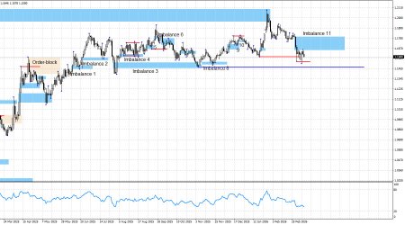 Пара EUR/USD находится на очередной для себя развилке. Вкратце перечислю основные технические моменты. Пара произвела съем ликвидности на покупку на прошлой неделе, произвела съем ликвидности на покупку на этой неделе, выполнила точечную отработку имбаланса 11, а еще буквально небольшое падение котировок приведет к отмене «бычьего» тренда. Таким образом, в ближайшее время либо имбаланс 11 должен быть инвалидирован, и тогда будет возобновлен «бычий» тренд, что является наиболее предпочтительным вариантом. Либо же «бычий» тренд должен быть сломан. И на текущий момент все идет к тому, что «бычий» тренд будет сломан. Вчера цена получила красноречивую реакцию на имбаланс 11, что означает образование «медвежьего» сигнала. Если этот сигнал приведет к падению пары хотя бы на 100 пипсов, «бычий» тренд может быть сломан. Шанс быков остается лишь в съемах ликвидности.