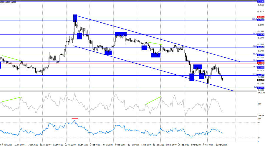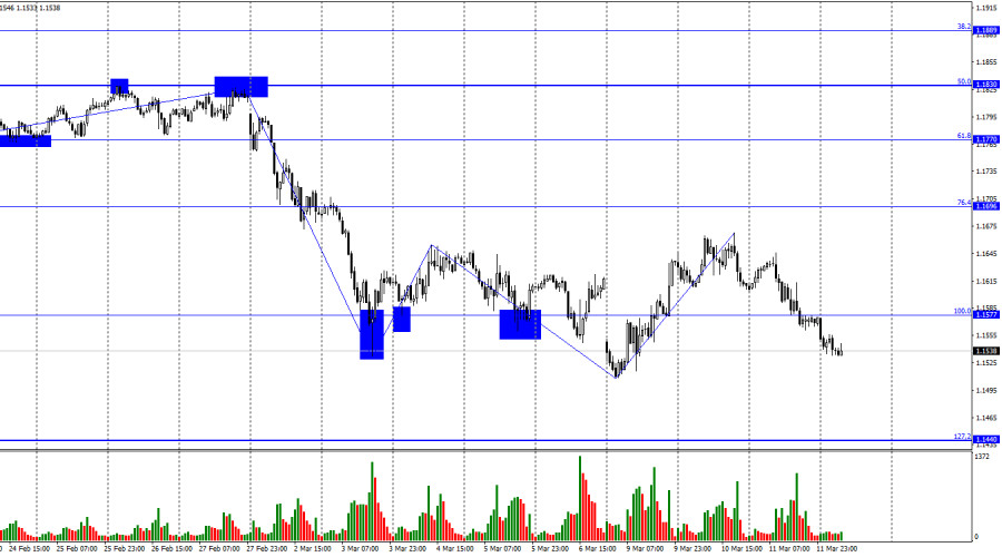Ситуация с волнами на часовом графике остается понятной. Последняя завершенная волна вниз пробила лоу предыдущей волны, а последняя волна вверх пробила предыдущий пик лишь на несколько пипсов. Таким образом, тренд в данное время может находиться в стадии изменения на «бычий». Действия Дональда Трампа на Ближнем Востоке спровоцировали масштабные военные действия с участием десятка государств, которые позволяли и позволяют доллару демонстрировать рост как «валюты-убежища». В среду информационный фон вновь значительно ухудшился для всех валют, которые не доллар. Стало известно, что Иран не собирается снимать блокаду Ормузского пролива, а также готов атаковать любые танкеры, которые будут пытаться преодолеть его. Таким образом, заявления Трампа о скором завершении войны в Иране не имеют под собой никакой почвы. Безусловно, мы не знаем дальнейших шагов Белого дома, однако риторика Тегерана остается воинственной. Этой ночью он нанес новые баллистические удары по союзникам США в регионе, а также атаковал три танкера в Персидском заливе. Цена на нефть марки Brent вновь перевалила за 100$, а Тегеран пообещал всему миру стоимость барреля нефти 200$. Таким образом, ситуация лучше со временем не становится. Медведи вновь ощутили прилив сил и начали новое наступление. Трейдерам остается внимательно следить за новостями из Тегерана и Белого дома, а также за событиями в Персидском заливе и на Ближнем Востоке. Каждое из них сейчас имеет большее значение для валютного рынка, чем любые экономические отчеты и действия центральных банков.