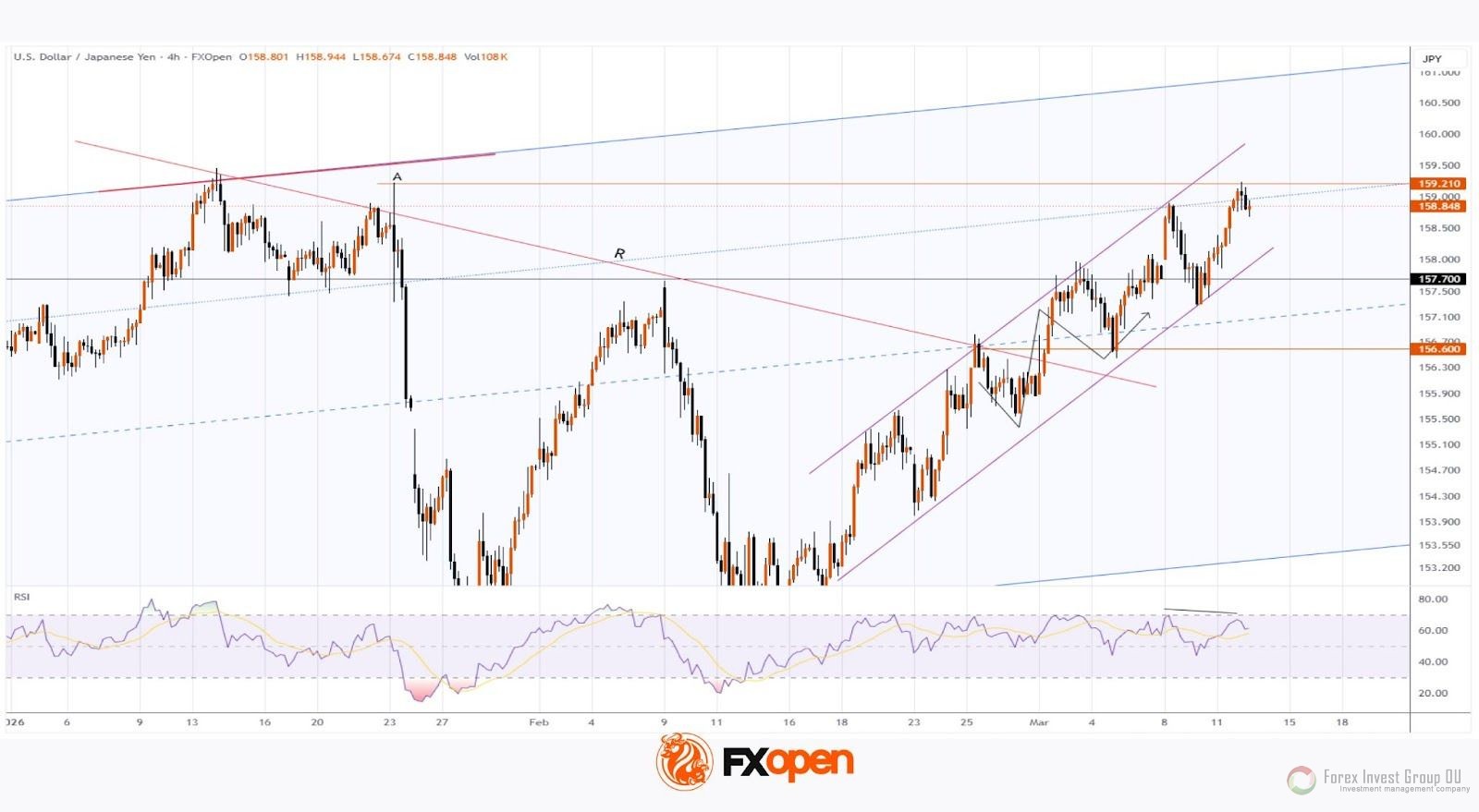 FxSignal 12-03-2026, 13:00 56 Аналитика, прогнозы валютного рынкаКак свидетельствует график USD/JPY, курс демонстрирует бычью динамику в начале марта, на что влияет начало военных действий на Ближнем Востоке.