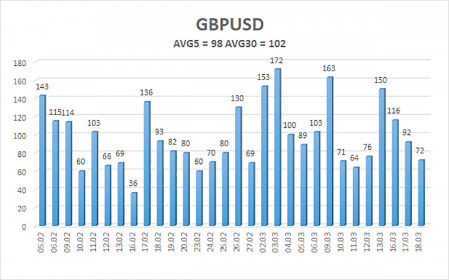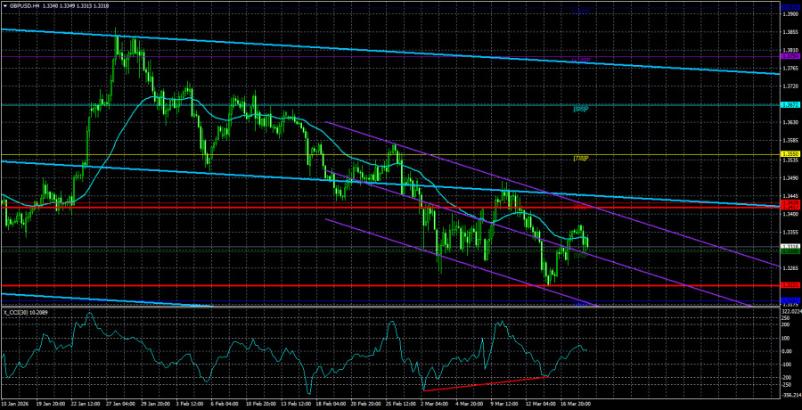 Валютная пара GBP/USD в среду также большую часть дня торговалась достаточно спокойно. Как это ни странно, но с открытием американской торговой сессии доллар вновь начал дорожать, хотя оснований для этого не было никаких. Дональд Трамп уже прямым текстом заявил, что очень скоро американские военные покинут регион Персидского залива, а цели военной операции достигнуты на 90%. Таким образом, в ближайшее время можно ожидать, если не завершения войны, то хотя бы ее перехода в более мягкую стадию. К сожалению, цены на нефть и газ продолжают расти, а последствия военной операции Трампа мир будет разгребать еще очень долго. Иран не готов пока пропускать ничьи корабли, кроме собственных союзников, вроде Китая или Индии. Таким образом, страны Европейского союза оказались на голодном пайке. Да и в любом случае, самих энергоносителей в Персидском заливе после ударов на нефтегазовой инфраструктуре стало гораздо меньше. По сути, проблема сейчас кроется уже не в блокаде Ормузского пролива, а в полной остановке добычи и переработки нефти во многих странах Ближнего Востока. Катар заявлял, что на восстановление разрушенной инфраструктуры уйдет, по меньшей мере, несколько месяцев. Только за эти несколько месяцев Иран может нанести новые удары, поэтому на скорую стабилизацию цен на нефть, газ и топливо рассчитывать не приходится. Вчера вечером состоялось второе заседание ФРС в текущем году, а мы уже по традиции не будем рассматривать его итоги через несколько часов после его завершения. В последние недели рынок абсолютно никакого внимания на обращал ни на макроэкономику, ни на фундамент. Поэтому реакция на заседание Американского регулятора может занять до 24 часов времени, оказаться очень неоднозначной, проходящей через призму энергетического кризиса и войны на Ближнем Востоке. Мы предпочитаем дождаться полной отработки этого события рынком, а уже затем делать выводы. Скажем только, что ФРС, благодаря Трампу, вновь оказалась в очень сложной ситуации. Рынок труда по-прежнему требует стимулирования, но после трех снижений ключевой ставки в прошлом году все же можно было рассчитывать на его постепенное восстановление. Однако экономика США в четвертом квартале тоже «попала в больницу», а вместе с этим индекс потребительских цен может начать ускоряться уже в следующем месяце. В итоге ФедРезерв будет вынужден мириться под гневные вопли президента США с низкими темпами роста экономики и отрицательными данными по рынку труда, стремясь удержать инфляцию от сильного роста. Однако даже это не факт, что получится сделать. Индекс цен производителей демонстрировал более высокие, нежели прогнозные, значения три месяца подряд, а война в Иране с вероятностью 100% спровоцирует рост цен на всё. Таким образом, Трамп сам себе вырыл яму. Теперь ФРС не сможет проводить смягчение, потому что действия Трампа спровоцируют рост инфляции. А приход Кевина Уорша на должность главы ФРС ничего не изменит, так как «ястребов» в составе FOMC все равно больше, чем «людей Трампа». Средняя волатильность пары GBP/USD за последние 5 торговых дней составляет 98 пунктов. Для пары фунт/доллар это значение является «средним». В четверг, 19 марта, таким образом, мы ожидаем движения внутри диапазона, ограниченного уровнями 1,3221 и 1,3417. Старший канал линейной регрессии развернулся вбок, что указыв