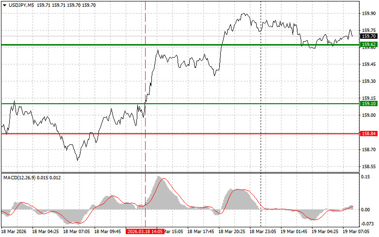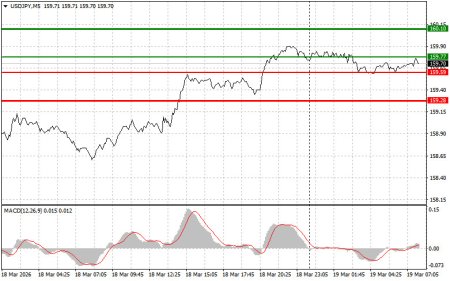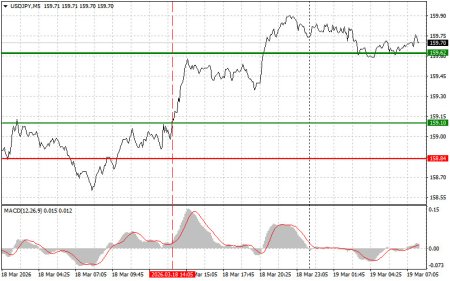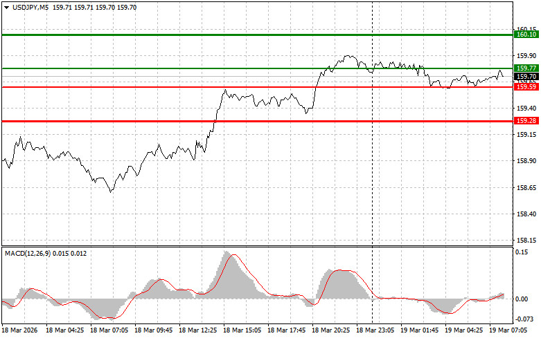 Разбор сделок и советы по торговле японской иенойТест цены 159.10 пришелся на момент, индикатор MACD много прошел вверх от нулевой отметки, что ограничивало восходящий потенциал пары. По этой причине я не покупал доллар. Сегодня йена сохранила свои позиции в паре с американским долларом после того, как Банк Японии оставил базовую процентную ставку без изменений на фоне эскалации войны в Иране. Центральный банк проголосовал за это решение 8 голосами против 1, при этом Хадзиме Таката выразил несогласие, призвав к повышению процентной ставки уже на втором заседании подряд.Несмотря на опасения по поводу инфляции и растущего геополитического напряжения, Япония продолжает придерживаться выжидательной позиции. Это решение Банка Японии свидетельствует о его уверенности в устойчивости японской экономики, несмотря на внешние шоки. Голосование 8 против 1 подчеркивает наличие различных мнений внутри центрального банка. Хадзиме Таката, единственный, кто выступает за более агрессивную политику, стремясь сдержать инфляционное давление и укрепить позиции йены. Его позиция отражает озабоченность по поводу потенциального обесценивания национальной валюты и роста цен. Однако рынку это явно мало, чтобы поверить в реальные планы по повышению ставок в ближайшем будущем.Что касается внутридневной стратегии, то больше буду опираться на реализацию сценариев №1 №2.Сценарии на покупкуСценарий №1: покупать USD/JPY сегодня планирую при достижении точки входа в районе 159.77 (зеленая линия на графике) с целью роста к уровню 160.10 (более толстая зеленая линия на графике). В районе 160.10 собираюсь выходить из покупок и открывать продажи в обратную сторону (расчет на движение в 30-35 пунктов в обратную сторону от уровня). К покупкам пары лучше всего возвращаться на коррекциях и серьезных просадках USD/JPY. Важно! Перед покупкой, убедитесь в том, что индикатор MACD находится выше нулевой отметки и только начинает свой рост от нее.Сценарий №2: покупать USD/JPY сегодня также планирую в случае двух подряд тестов цены 159.59 в момент, когда индикатор MACD будет находиться в области перепроданности. Это ограничит нисходящий потенциал пары и приведет к обратному развороту рынка вверх. Можно ожидать рост к противоположным уровням 159.77 и 160.10.Сценарии на продажу Сценарий №1: продавать USD/JPY сегодня планирую лишь после обновления уровня 159.59 (красная линия на графике), что приведет к быстрому снижению пары. Ключевой целью продавцов будет уровень 159.28, где собираюсь выходить из продаж, а также открывать сразу покупки в обратную сторону (расчет на движение в 20-25 пунктов в обратную сторону от уровня). Продавать лучше, как можно выше. Важно! Перед продажей, убедитесь в том, что индикатор MACD находится ниже нулевой отметки и только начинает свое снижение от нее. Сценарий №2: продавать USD/JPY сегодня также планирую в случае двух подряд тестов цены 159.77 в момент, когда индикатор MACD будет находиться в области перекупленности. Это ограничит восходящий потенциал пары и приведет к обратному развороту рынка вниз. Можно ожидать снижения к противоположному уровню 159.59 и 159.28.Что на графике: Тонкая зеленая линия – цена входа, по которой можно покупать торговый инструмент. Толстая зеленая линия – предположительная цена, где можно расставлять Take profit или самостоятельно фиксировать прибыли, так как выше этого уровня