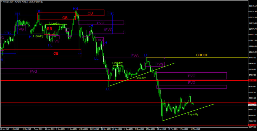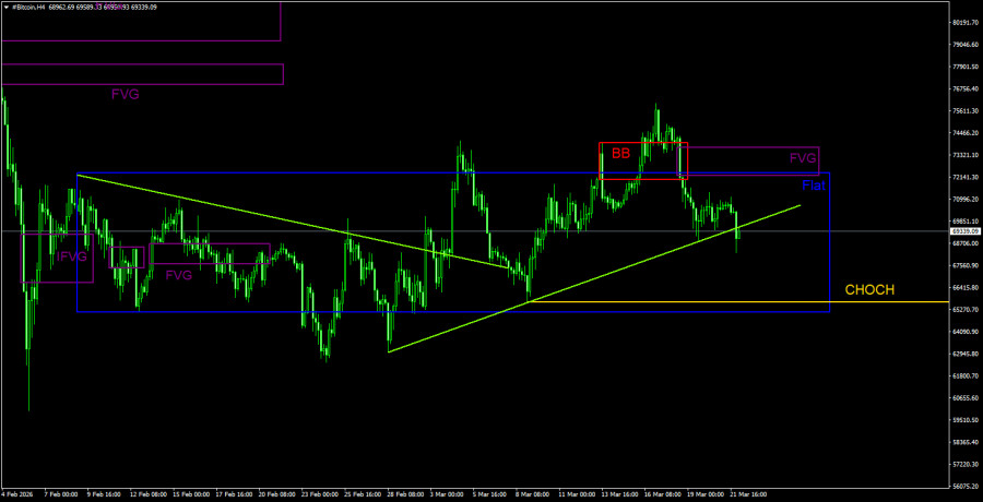 Биткоин на этой неделе продемонстрировал неплохой рост и покинул пределы бокового канала, в котором провел не менее месяца. Однако затем последовало новое падение, которое еще раз доказало очевидный факт – текущее движение является коррекцией. Цена движется вверх очень слабо с большими коррекциями и частыми откатами. Цена вроде бы покинула боковой канал, но отдалиться от него не может. На 4-часовом ТФ вроде бы формируется восходящий тренд, но «бычьи» паттерны игнорируются. Линии тренда на обоих ТФ – это в первую очередь цели для медведей, а не поддержка для быков. Таким образом, мы по-прежнему не сомневаемся, что биткоин возобновит нисходящий тренд последних 6 месяцев. Сегодня ночью линия тренда на 4-часовом ТФ была пробита. Таким образом, уже в ближайшее время цена может продолжить падение. Формальным ориентиром выступает нижняя граница бокового канала, который уже не является актуальным. Поэтому в качестве целей мы бы рассматривали область ниже линии тренда на дневном ТФ, а также уровень 57 500$. Если сейчас начинается новый виток нисходящей тренда, то важно понять, где можно открывать короткие позиции. Рядом с ценой таких областей практически нет. Лишь FVG на 4-часовом ТФ имеет реальные шансы на отработку в ближайшее время. На этой неделе состоялось заседание ФРС, на котором настрой регулятора поменялся на более «ястребиный». Или лучше сказать на менее «голубиный». Стало известно, что в течение 2026 года ФедРезерв готовится к максимум одному смягчению монетарной политики, вместо двух ранее. ФРС ожидает резкого ускорения инфляции, а заседания ЕЦБ и Банка Англии подтвердили, что инфляция из-за ближневосточного кризиса может разогнаться по всему миру в 2026 году. Биткоин вполне закономерно упал, потому что о дальнейшем смягчении монетарной политики речи теперь не идет ни в Великобритании, ни в США, ни в Европе.