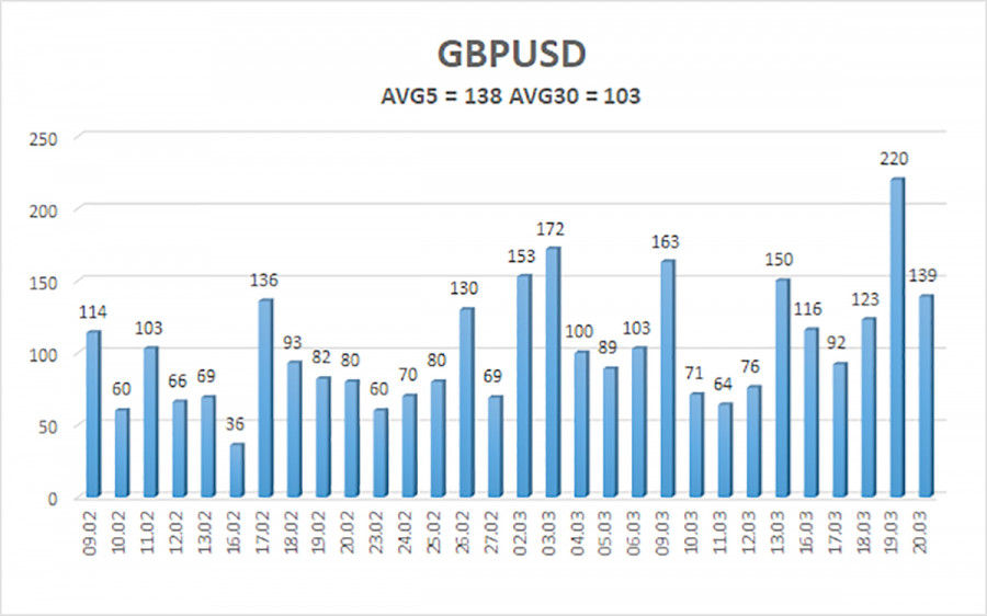 Валютная пара GBP/USD в пятницу показала довольно сильное падение, которое не было связано ни с чем. Буквально в четверг Банк Англии продемонстрировал «ястребиный» настрой, и фунт стерлингов впервые за долгое время порадовался. Однако уже в пятницу он вновь попал под прессинг, а что будет на следующей неделе – не знает никто. Как мы уже говорили, основной темой для валютного рынка остается геополитика. В субботу Дональд Трамп сообщил о готовности нанести удары по энергетической инфраструктуре Ирана, если Тегеран не разблокирует Ормузский пролив в течение 48 часов. В воскресение Иран ответил, что если Вашингтон нанесет удар по энергетике, Иран нанесет удар в ответ по энергетике и информационно-технологическим объектам в регионе. Тегеран предупредил, что в этом случае весь Ближний Восток погрузится в тотальный блэкаут без воды и доступа в интернет. Как видим, деэскалацией конфликта в данное время и не пахнет. Так как следующая неделя может принести только негативные геополитические новости, макроэкономический фон может вновь отойти на второй план. В текущих обстоятельствах мы не видим никаких причин рассматривать экономические данные, так как они с вероятностью 90% не будут отработаны рынком. Тем не менее, все же обратим внимание трейдеров на наиболее важные из них. Вдруг в дни публикации у Тегерана и Вашингтона будет выходной, и тогда рынок переключит внимание на макроэкономику. Во вторник будут опубликованы индексы деловой активности в секторах производства и услуг за март. Вполне вероятно, что деловая активность существенно сократится, но сокращаться она будет по всему миру, а не только в ЕС или Великобритании. Вопрос лишь в том, где падение будет более сильным? В среду в Великобритании выйдет отчет по инфляции за февраль, но в феврале конфликт на Ближнем Востоке еще не начался, поэтому ожидать ускорения инфляции не имеет смысла. В любом случае Банк Англии уже дал понять, что он ожидает роста инфляции во втором и третьем кварталах, поэтому практически любое значение показателя потребительских цен за февраль уже не является актуальным и интересным. Всех интересует, что насколько вырастет инфляция по итогам марта и следующих месяцев. В оставшиеся два дня недели будет опубликовано несколько отчетов «второго сорта» в Британии и США, на которые вряд ли кто-либо обратит внимание. К сожалению, в следующие пять дней динамика валютного рынка будет вновь зависеть от геополитических событий. И чем хуже будут поступать новости с Ближнего Востока, тем больше шансов увидеть новый рост доллара США. В техническом плане пара GBP/USD закрепилась выше мувинга в четверг, а уже в пятницу опустилась обратно ниже скользящей средней линии. Геополитика может провоцировать самые разнообразные движения, которые не будут соответствовать технической картине. Средняя волатильность пары GBP/USD за последние 5 торговых дней составляет 138 пунктов. Для пары фунт/доллар это значение является «высоким». В понедельник, 23 марта, таким образом, мы ожидаем движения внутри диапазона, ограниченного уровнями 1,3202 и 1,3478. Старший канал линейной регрессии развернулся вбок, что указывает на разворот тренда. Индикатор CCI заходил в область перепроданности дважды, что еще раз предупредило о завершении коррекции, а также сформировал «бычью» дивергенцию. Ближайшие уровни подд