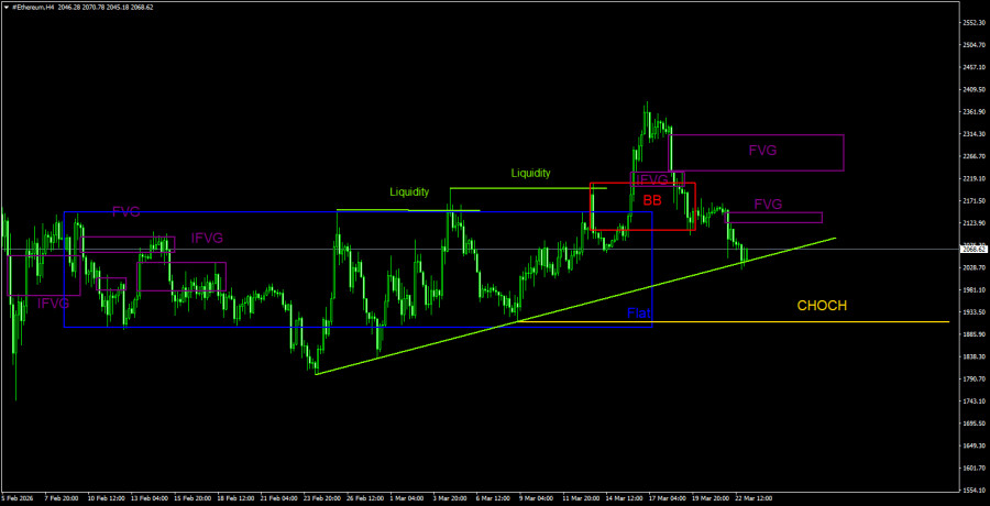 Биткоин продолжает формирование полноценного нисходящего тренда. Мы продолжаем ожидать падения с целью 57 500$(уровень 61,8% по Фибоначчи от трехлетнего восходящего тренда), а признаков разворота тренда в данное время ни одного. Но даже уровень 57 500$ теперь не выглядит, как конечная остановка. Из областей POI в данное время можно отметить только ближайший «медвежий» FVG на дневном ТФ, который располагается достаточно далеко от цены. На 4-часовом ТФ теоретически можно использовать последний FVG для поиска сигналов на продажу. Снизу остается очевидная цель – пул ликвидности ниже сразу двух линий тренда.Рекомендации по торговле ETH/USD: