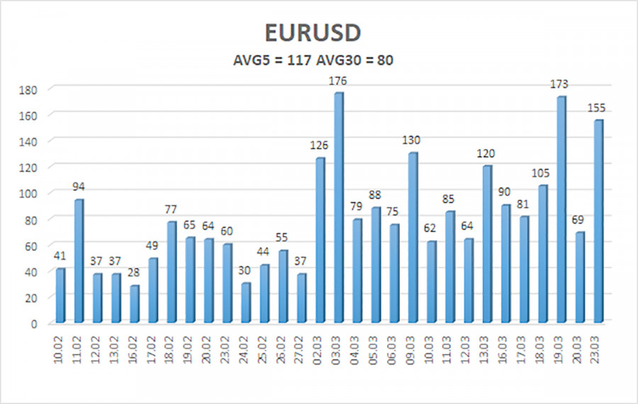 Валютная пара EUR/USD в течение понедельника торговалась тихо, мирно, спокойно, ничего не предвещало беды. Пока на сцену не вышел Дональд Трамп и не ошарашил рынки. Президент США сообщил, что за последние несколько дней с Тегераном были проведены «очень хорошие переговоры», поэтому он откладывает свое решение об ударе по иранской энергетике на 5 дней. Доллар тут же рухнул по всему валютному рынку, нефть и газ обрушились в цене, биткоин взлетел вверх. Спасибо, царю! Правда, уже через полчаса официальные лица Ирана сообщили, что никаких переговоров с Вашингтоном не ведется, а Трамп попросту испугался угроз об ответном ударе по энергетике и информационным объектам в регионе. Напомним, что в воскресение Тегеран действительно опубликован заявление, что в том случае, если ВВС США нанесут удары по энергетике Ирана, в ответ тут же будет нанесен удар по всем союзникам США на Ближнем Востоке. И под удар попадут не только электростанции, но и очистительные станции(питьевая вода), а также объекты информационного характера(интернет). Однако Дональд Трамп продолжил настаивать на своем: война скоро будет завершена, переговоры продолжаются, в скором времени конфликт на Ближнем Востоке прекратится. Что ж, в очередной раз можно только подметить несколько вещей, характерных всем действиям Трампа. Во-первых, принцип TACO – «Трамп всегда сдает назад». С этим принципом знакомы уже все трейдеры, он выражает собой постоянные угрозы американского президента, а затем отступление. Конечно, работает он не всегда, но очень часто. Во-вторых, Трамп в очередной раз(с высокой долей вероятности) сделал заявление, не соответствующее действительности. Напомним, что во времена первой каденции Трампа многие социологические агентства специально вели подсчеты, сколько раз в день Трамп делает ложные заявления. Насчитали около 15... В-третьих, как мы и говорили ранее, Трамп в любой момент может объявить о тотальной победе «добра над злом» и выйти из игры. А почему нет? Иранские ракеты не могут физически долететь до Америки, а удары Ирана по союзникам в регионе вряд ли сильно беспокоят лидера США. Он попытался устранить «иранскую ядерную угрозу» и провести государственный переворот в Иране. Не получилось. Теперь нужно срочно заявить о полной победе и завершить участие США в этой войне. К слову, американская военно-морской флот уже отведен на сотни километров от Персидского залива. Поэтому продолжится война или нет, Штаты в ней участвовать уже не будут. А вот Ормузский пролив будет заблокирован до тех пор, пока Иран не решит его разблокировать. А сколько для этого понадобится времени теперь, не знает никто. Скорее всего, теперь Иран будет использовать Ормузский для шантажа всего мира, чтобы снять с себя как можно больше санкций и получить как можно больше преференций. И надо сказать, что Европа может быть заинтересована в этом. Средняя волатильность валютной пары EUR/USD за последние 5 торговых дней по состоянию на 24 марта составляет 117 пунктов и характеризуется, как «средняя». Мы ожидаем движение пары между уровнями 1,1478 и 1,1712 во вторник. Старший канал линейной регрессии развернулся вниз, что указывает на смену тренда. Индикатор CCI вновь заходил в область перепроданности и сформировал «бычью» дивергенцию, что в очередной раз предупредило завершении нисходящей тенденции. Ближайши