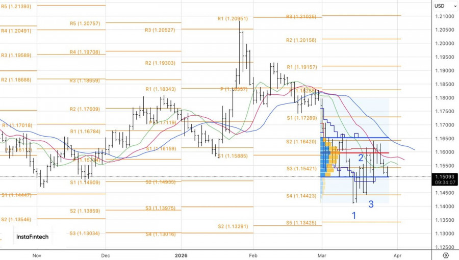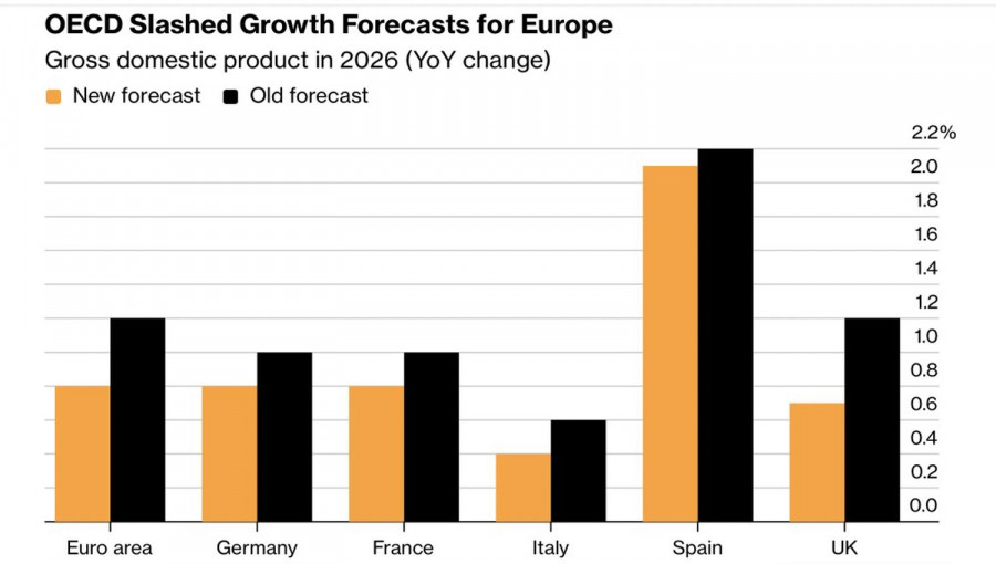 Самым удивительным является тот факт, что, несмотря на дикие колебания, нефть не обновляет рекордные максимумы на протяжении почти трех недель. Этому способствует как распространяемый Белым домом оптимизм, так и постепенная переориентация маршрутов поставок, а также поступающие на рынок баррели из стратегических резервов. Динамика доллара США и S&P 500Американский доллар растет, но все-таки не успевает за падением фондовых индексов. Одним из драйверов укрепления гринбэка во время конфликта на Ближнем Востоке является его статус убежища. При этом разгром S&P 500 на последней полной неделе марта предполагает, что EUR/USD должна торговаться существенно ниже. Рынок акций США напуган стагфляцией. Действительно, эксперты Bloomberg понизили прогноз по американскому ВВП на 2026 с 2,5% до 2,3%. Они видят более серьезные риски рецессии в течение следующих 12 месяцев – в 30%, по сравнению с 25% ранее. Оценка инфляции в виде индекса расходов на личное потребление, напротив, выросла с 2,6% до 3,1%. Однако ОЭСР, напротив, подняла прогноз по валовому внутреннему продукту США с 1,7% до 2% со ссылкой на инвестиции в технологии искусственного интеллекта. А вот оценки в энергозависимой Европе, напротив, были срезаны. Прогнозы ОЭСР по европейским экономикамЕврозона явно пострадает больше от конфликта на Ближнем Востоке, чем Соединенные Штаты. Это является еще одним аргументом в пользу продаж EUR/USD. Хотя, возможно, будут некие подводные камни. Так основная валютная пара выросла в ответ на тарифы Белого дома в отношении ЕС. Инвесторы посчитали, что их будут уплачивать американцы. Таким образом, падение EUR/USD показывает, что Дональду Трампу не удалось бросить спасательный круг при помощи примирительной риторики. На Ближнем Востоке нет торговой войны. Война здесь настоящая. И Иран не собирается идти на попятную, сколько бы президент США не оттачивал свое мастерство переговоров. При этом нужно понимать, что эскалация конфликта чревата обновлением Brent недавних максимумов. Технически на дневном графике EUR/USD имеет место падение котировок к нижней границе диапазона справедливой стоимости 1,151-1,165. Прорыв поддержки на 1,151 позволит нарастить сформированные от 1,160 шорты. В качестве целевых ориентиров нисходящего движения евро против американского доллара выступают пивот-уровни 1,144 и 1,134.Материал предоставлен компанией InstaForex - www.instaforex.com