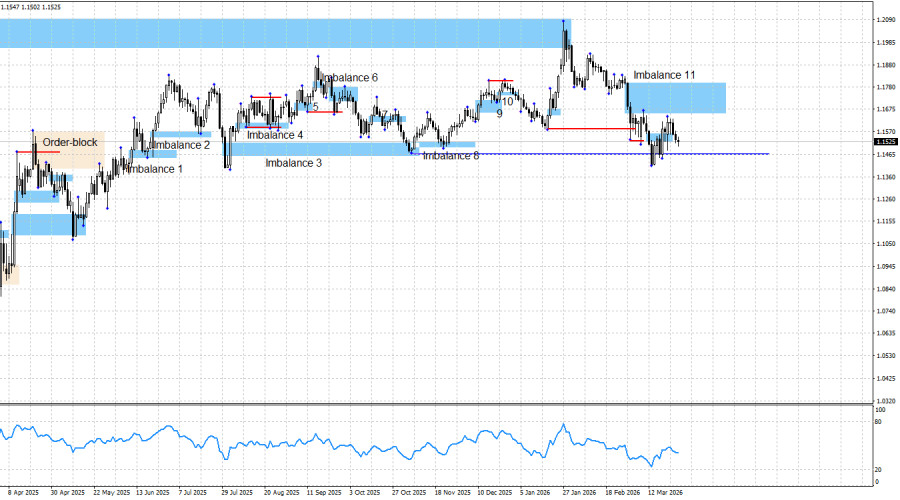 Весь рост американской валюты в последние 4-5 недель был обеспечен геополитикой. Именно поэтому я неоднократно говорил, что не верю в завершение «бычьего» тренда, несмотря на пробой важных, трендообразующих лоу. В данное время имбаланс 12 можно считать инвалидированным, но в то же время реакции на имбаланс 11 получено не было. Таким образом, и быки могут продолжить свои атаки, и медведи могут возобновить свое наступление. Движение последних 2 месяцев вполне может стать «медвежьим» трендом, если геополитика и дальше будет всячески поддерживать доллар. Но на текущий момент я по-прежнему не уверен в завершении «бычьего» тренда. Новых сигналов, ни «бычьих», ни «медвежьих» в любом случае нет. Дальнейший рост доллара США возможен лишь в том случае, если геополитика и дальше будет оказывать серьезную поддержку медведям. А, как я уже говорил, для этого требуется, чтобы ситуация на Ближнем Востоке не просто оставалась сложной, а чтобы она становилась еще хуже. Куда еще хуже, чем сейчас? Нефть должна продолжать расти к тем самым 150-200$ за баррель (что она успешно и делает), в конфликт на Ближнем Востоке должны вступать новые государства, экономики развитых стран мира должны в буквальном смысле слова страдать от высоких цен на нефть и газ. А сам конфликт должен растянуться на долгие месяцы. Ранее я говорил, что предпосылок для такого сценария я не вижу, но позитивных вестей с Ближнего Востока не поступает никаких. Ситуация может вспыхнуть с новыми силами в любой момент. Новых паттернов для открытия позиций в данное время нет. В ближайшее время может быть отработан только имбаланс 11, и в случае реакции цены на этот паттерн, трейдеры получат возможность для открытия сделок на продажу. Однако на данный момент имбаланс 11 остается неотработанным (во второй раз), а других паттернов для торговли нет. Графическая картина пока еще продолжает сигнализировать о «бычьей» доминации. «Бычий» тренд остается в силе, однако в данное время трейдеры-быки остаются в незавидном положении из-за резко изменившегося информационного потока. Чтобы открывать новые сделки на покупку, нужны новые «бычьи» паттерны или хотя бы съем ликвидности с двух последних «медвежьих» свингов. Съем ликвидности мы увидели, но он не является паттерном, по нему нельзя открывать торговые сделки. Информационный фон в пятницу фактически отсутствовал. Ни в Европе, ни в США к текущему моменту не было ни одной интересной публикации. Дональд Трамп продолжает настаивать на ведении переговоров с Ираном и даже во второй раз отсрочил удары по иранской энергетике. Но все эти «сказки» мало спасают доллар и нефть от нового роста. Причин у быков атаковать остается огромное количество, и даже с началом войны на Ближнем Востоке их меньше не стало. Структурно и глобально политика Трампа, которая привела к серьезному падению доллара в прошлом году, не поменялась. В ближайшее время американская валюта может демонстрировать рост на фоне бегства инвесторов от риска, но этот фактор не сможет оказывать ей поддержку постоянно. А других факторов поддержки у американской валюты нет. В «медвежий» тренд я по-прежнему не верю. Доллар получил временную поддержку рынка, но не факт, что такая ситуация будет сохраняться долгое время. Однако «бычий» тренд сломлен, и это следует признать, как это ни печально. Есть еще шанс 