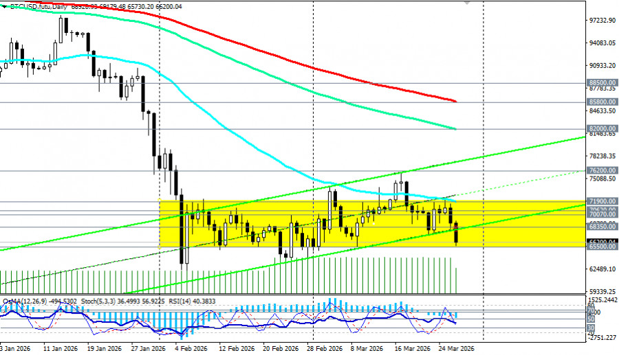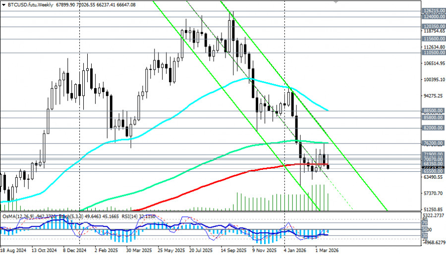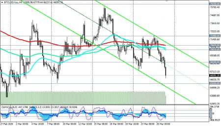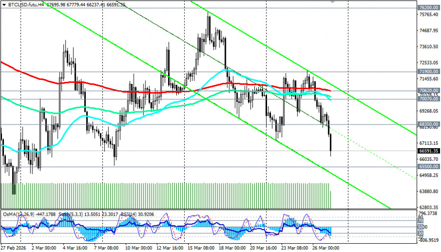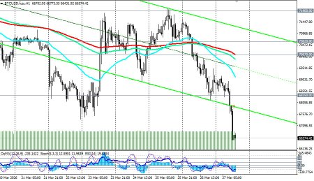 Март 2026 года войдет в историю крипторынка как период фундаментального сдвига парадигмы. Биткоин, завершая последнюю неделю месяца ниже важного сопротивления 71900.00 (ЕМА50 на дневном графике BTC/USD) и торгуясь в первой половине американской торговой сессии пятницы в районе 67000.00-66000.00, демонстрирует парадоксальную устойчивость, отметили мы в нашем сегодняшнем фундаментальном анализе и обзоре «Крипторынок (BTC): парадокс «тихой гавани» в эпоху геополитического шторма». С технической точки зрения, пара BTC/USD тестирует на пробой ключевой уровень поддержки 65500.00 (ЕМА50 на месячном графике), пробой которого (после пробоя уровня поддержки 68350.00 и ЕМА200 на недельном графике) подтвердит переход цены в зону долгосрочного медвежьего рынка. Данный медвежий сценарий возможен при: