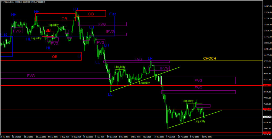 День ото дня ситуация на криптовалютном рынке не меняется уже полтора месяца. На дневном ТФ это все та же вялая и слабая восходящая коррекция, на 4-часовом ТФ – это все тот же флэт с минимальным восходящим уклоном. Таким образом, сейчас – максимально непривлекательное время для торговли, так как и чистого флэта нет, и трендовое движение тоже отсутствует. Президент США заявил в понедельник об успешных переговорах с Ираном, в следствие чего ультиматум о нанесении ударов по энергетике был отложен на 5 дней. Позже Трамп перенес решение нанести удары по энергетике еще на 10 дней – до 6 апреля, и вся эта история уже выглядит, как попытка Вашингтона упросить Тегеран прекратить огонь и разблокировать Ормузский пролив. Если в первый раз биткоин испытал небольшой прилив оптимизма, то на все последующие примирительные спичи Трампа рынок отвечал продажами рисковых активов и покупками безопасных. Большая часть паттернов на 4-часовом ТФ игнорируется, что еще раз характеризует текущее движение, как непривлекательное. На дневном ТФ новых паттернов нет, а те, которые уже присутствуют на графике, биткоин не может отработать. С уверенностью сейчас можно сказать только одно. Движение последних полутора месяцев – коррекция, снизу у биткоина остается достаточно очевидных целей, а инвесторы не спешат покупать «цифровое золото», несмотря на привлекательность текущих цен и заверения Майкла Сэйлора, Роберта Кийосаки и Кэти Вуд о росте биткоина до миллиона долларов и выше. На наш взгляд, нисходящий тренд не завершен, и он в любом случае слишком краткосрочный, чтобы ожидать сейчас начало нового «бычьего» тренда. К сожалению, большинство паттернов на 4-часовом ТФ вообще не отрабатывается, а на дневном ТФ биткоин не сумела скорректироваться даже к ближайшему «медвежьему» FVG.
