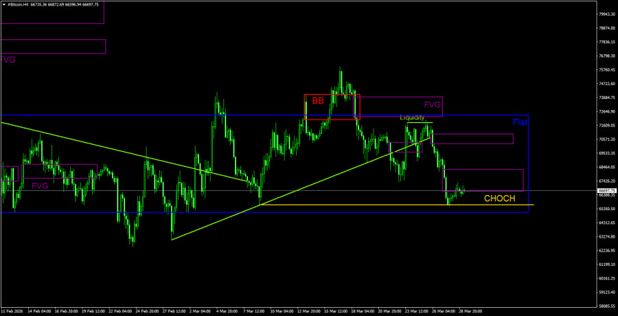 На 4-часовом таймфрейме цена опустилась к нижней границе бокового канала, и на данный момент совершенно неясно: возобновлен флэт или нет? Линия CHOCH, которая является опорой для восходящей коррекции, пролегает на уровне 65 500$, и она не была пробита или преодолена. Преодоление этой линии укажет на завершение коррекции, которая длится уже полтора месяца. В ходе последнего витка падения было сформировано два новых «медвежьих» FVG, а на дневном ТФ был сформирован сигнал на продажу в виде снятия ликвидности и реакции на «медвежий» FVG. Таким образом, в данное время криптовалюта может стоять на пороге нового витка нисходящего тренда.Рекомендации по торговле BTC/USD: