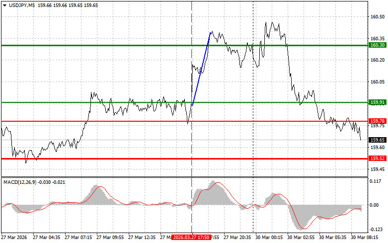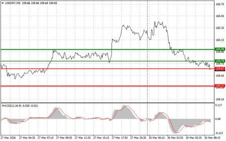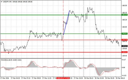 Разбор сделок и советы по торговле японской иенойТест цены 159.91 пришелся на момент, индикатор MACD только начинал движение вверх от нулевой отметки, что стало подтверждением правильной точки входа на покупку доллара. В результате пара выросла в район целевого уровня 160.30.Рост цен на энергоносители и риск усиления инфляционного давления привели к очередному падению иены против американского доллара. Этот тренд, набирающий обороты с начала текущего года, ставит японскую экономику перед лицом новых вызовов. Зависимость страны от импорта энергоресурсов делает ее особенно уязвимой к внешним шокам, в то время как внутренние факторы, такие как низкие процентные ставки Банка Японии, продолжают оказывать давление на национальную валюту.Уже сегодня в ходе азиатских торгов иена откатилась от самого низкого уровня с июля 2024 года на фоне предупреждений, свидетельствующих о готовности Японии к потенциальным интервенциям для поддержки валюты. Японская валюта укрепилась, опустившись ниже пристально отслеживаемого уровня в 160 пунктов по отношению к доллару, после того как главный валютный чиновник страны заявил, что в случае продолжения подобной ситуации могут потребоваться решительные меры. Затем рост продолжился после того, как глава Банка Японии Кадзуо Уэда заявил, что колебания валютного курса являются фактором, оказывающим значительное влияние на экономику и цены.Что касается внутридневной стратегии, то больше буду опираться на реализацию сценариев №1 №2.Сценарии на покупкуСценарий №1: покупать USD/JPY сегодня планирую при достижении точки входа в районе 159.79 (зеленая линия на графике) с целью роста к уровню 160.00 (более толстая зеленая линия на графике). В районе 160.00 собираюсь выходить из покупок и открывать продажи в обратную сторону (расчет на движение в 30-35 пунктов в обратную сторону от уровня). К покупкам пары лучше всего возвращаться на коррекциях и серьезных просадках USD/JPY. Важно! Перед покупкой, убедитесь в том, что индикатор MACD находится выше нулевой отметки и только начинает свой рост от нее.Сценарий №2: покупать USD/JPY сегодня также планирую в случае двух подряд тестов цены 159.67 в момент, когда индикатор MACD будет находиться в области перепроданности. Это ограничит нисходящий потенциал пары и приведет к обратному развороту рынка вверх. Можно ожидать рост к противоположным уровням 159.79 и 160.00.Сценарии на продажу Сценарий №1: продавать USD/JPY сегодня планирую лишь после обновления уровня 159.67 (красная линия на графике), что приведет к быстрому снижению пары. Ключевой целью продавцов будет уровень 159.37, где собираюсь выходить из продаж, а также открывать сразу покупки в обратную сторону (расчет на движение в 20-25 пунктов в обратную сторону от уровня). Продавать лучше, как можно выше. Важно! Перед продажей, убедитесь в том, что индикатор MACD находится ниже нулевой отметки и только начинает свое снижение от нее. Сценарий №2: продавать USD/JPY сегодня также планирую в случае двух подряд тестов цены 159.79 в момент, когда индикатор MACD будет находиться в области перекупленности. Это ограничит восходящий потенциал пары и приведет к обратному развороту рынка вниз. Можно ожидать снижения к противоположному уровню 159.67 и 159.37.Что на графике: Тонкая зеленая линия – цена входа, по которой можно покупать торговый инструмент. Толстая зеленая линия – предполож