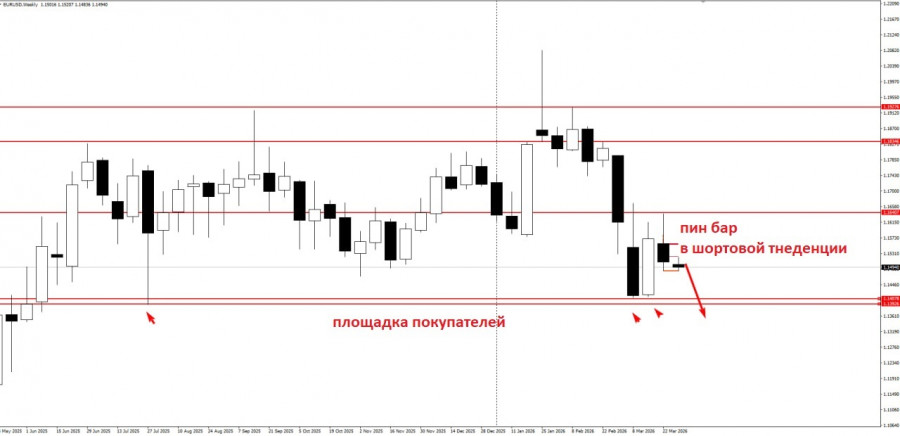 Итак, прошлая торговая неделя закрылась пин-баром в шортовой тенденции, которая указывает на продолжение шортового трнеда по инструменту. С другой стороны, внизу остались заманчивые площадки покупателей, которые являются магнитом для маркатмейкеров.Предлагаю рассмотреть шортовые позиции с отката на шортовый слом по схеме, представленной на скрине выше.