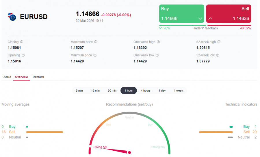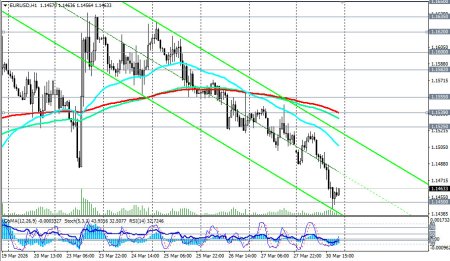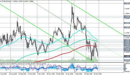 *см. также: Торговые индикаторы InstaForex по EUR/USD Пара EUR/USD завершает сегодняшний торговый день и первый квартал 2026 года на минорной ноте, торгуясь на текущий момент вблизи отметки 1.1463 после достижения в ходе американской сессии двухнедельного минимума ниже 1.1440. Текущая ситуация: пятый день падения Президент США Дональд Трамп в понедельник заявил, что Белый дом ведет переговоры с иранскими представителями, и в двустороннем диалоге уже достигнут «большой прогресс». Однако он предупредил, что, если финального соглашения не удастся заключить, а Ормузский пролив не будет деблокирован, американские вооруженные силы уничтожат всю энергетическую инфраструктуру Ирана. В выходные Корпус стражей исламской революции (КСИР) нанес ракетно-беспилотные удары по алюминиевым заводам в ОАЭ и Бахрейне, что может ускорить рост потребительских цен, поскольку теперь драйвером выступит не только высокая стоимость энергоносителей, но и алюминиевого сырья. Между тем, доллар как защитный актив укрепляется, а его индекс USDX торгуется около 100.40, находясь вблизи десятимесячных максимумов, достигнутых ранее в этом месяце. Доллар получает поддержку от бегства от риска, вызванного геополитической напряженностью, и от роста цен на нефть, которые номинированы в долларах США. Ключевые факторы: дивергенция рисков Председатель Федеральной резервной системы Джером Пауэлл в понедельник заявил, что «политика находится в хорошем положении, чтобы подождать и посмотреть, как развернется текущая ситуация». Он отметил, что события на Ближнем Востоке влияют на цены на газ, но подчеркнул, что склонность ФРС — «не обращать внимания на шоки предложения», хотя необходимо следить за инфляционными ожиданиями. Член ФРС Стивен Миран заявил, что «нет доказательств спирали заработной платы и цен», а инфляционные ожидания «пока не затронуты ростом цен на нефть». Он добавил, что «возможно, ставка может быть снижена примерно на один пункт в течение года», а инфляция вернется к целевому уровню через год. Согласно инструменту CME FedWatch, трейдеры все больше ожидают, что ФРС сохранит процентные ставки на текущем уровне до 2026 года, после того как ранее в ценах была заложена почти 50% вероятность повышения стоимости заимствований к концу 2026 года. В то же время, предварительные данные по инфляции в Германии за март показали резкий рост ценового давления: годовой CPI вырос с 1,9% до 2,7%, а гармонизированный индекс — с 2,0% до 2,8%, что в основном было обусловлено подорожанием энергоносителей и продуктов питания. Экономисты ожидают, что общая инфляция в еврозоне вырастет на 0,8 процентного пункта до 2,7% в годовом исчислении, в то время как базовая инфляция немного снизится до 2,3%. Они отмечают, что ЕЦБ усилил ястребиную риторику, готовя возможные «небольшие страховые повышения ставок». Глава Банка Франции Франсуа Виллеруа де Гальо подчеркнул, что финансовые власти полны решимости предотвратить ускорение темпов инфляции, вызванной коррекцией цен на нефть, но пока преждевременно прогнозировать даты возможных корректировок. Однако, как отмечают в Societe Generale, если конфликт на Ближнем Востоке не ослабнет, апрельские опросы, вероятно, покажут более заметные негативные эффекты. Трейдеры начинают снижать ожидания немедленного повышения ставок в апреле, поскольку экономика еврозоны считается более уязви