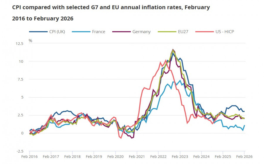 Инфляция в Великобритании в феврале осталась на прежнем уровне 3%, это на текущий момент полностью устаревшие данные, поскольку они не учитывают скачок цен в марте из-за кризиса на рынке энергоносителей. В то же время даже в этих стабильных условиях базовая инфляция показала рост с 3.1% до 3.2%, это практически наверняка означает, что в марте рост покажут все ценовые компоненты. Если сравнивать ценовую динамику в Великобритании и странами ЕС, то общий уровень цен на начало марта оставался заметно выше. И если уже по ЕЦБ прогнозы предполагают повышение ставки уже в апреле, то по Банку Англии последние рыночные ожидания предполагают три повышения ставки в текущем году.