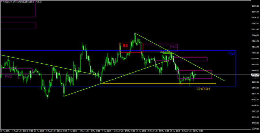 На 4-часовом таймфрейме цена опустилась к нижней границе бокового канала, сформировала девиацию/отскок от нее, а теперь вновь может устремиться вверх. Линия CHOCH, которая является опорой для восходящей коррекции, пролегает на уровне 65 500$, и она не была преодолена. Преодоление этой линии укажет на завершение коррекции, которая длится уже полтора месяца. В ходе последнего витка падения было сформировано два новых «медвежьих» FVG, но если флэт продолжается, внутренние паттерны не имеют никакого значения.Рекомендации по торговле BTC/USD: