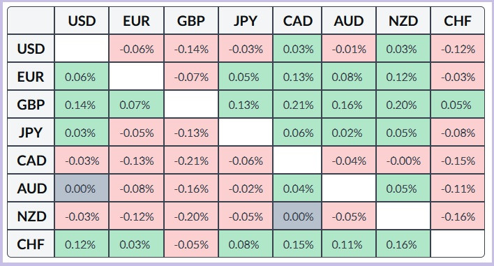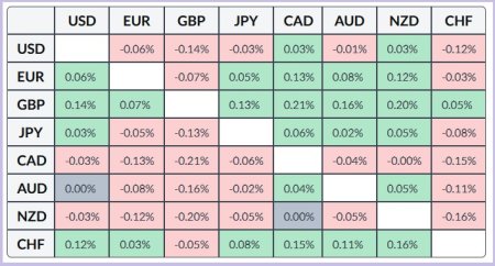 А с технической точки зрения осцилляторы на дневном графике положительны, индекс торгуется выше всех скользящих средних, но стоит обратить внимание, что индекс относительной силы стал ближе к зоне перекупленности, это показывает, что покупатели могут остаться в консолидации на короткий срок. Так же 100- и 200-дневные SMA почти без наклона, подсказывая о некоторой консолидации.В таблице ниже представлена динамика курса доллара США относительно основных мировых валют за текущий день: наибольшее укрепление наблюдается в паре с новозеландским долларом.