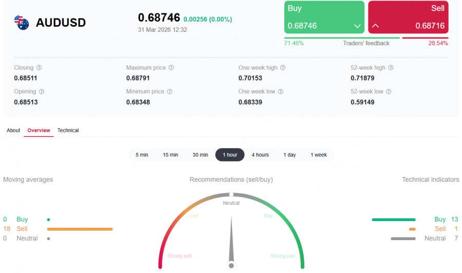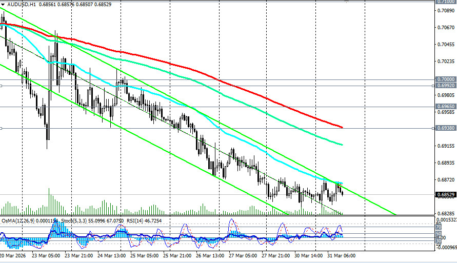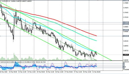 *см. также: Торговые индикаторы InstaForex по AUD/USD[i][/i] Пара AUD/USD завершает первый квартал 2026 года в состоянии неопределенности, консолидируясь в районе 0.6840-0.6870 в ходе первой половины сегодняшнего торгового дня после публикации протоколов мартовского заседания Резервного банка Австралии и заявлений президента США Дональда Трампа о готовности завершить войну с Ираном. Австралийский доллар оказался в эпицентре столкновения двух сил: с одной стороны - ястребиный RBA, сохраняющий возможность повышения ставки в мае, с другой - укрепляющийся доллар США и растущие стагфляционные риски в мировой экономике. Текущая ситуация: отскок на надеждах на мир Во вторник, 31 марта, пара AUD/USD выросла на 0,15% до 0.6870-0.6875 после заявления президента США Дональда Трампа о готовности завершить военную кампанию против Ирана, даже если Ормузский пролив останется в значительной степени закрытым. Фьючерсы на индекс S&P500 выросли более чем на 0.7%, также отражая улучшение аппетита инвесторов к риску. Однако австралийский доллар остается под давлением: с начала конфликта 28 февраля пара снизилась примерно на 3,5%. Рост цен на нефть WTI выше 100 долларов за баррель и угроза блокировки Баб-эль-Мандебского пролива продолжают оказывать давление на валюты стран, зависимых от импорта энергоносителей (Австралия экспортирует сжиженный газ и каменный уголь, но ввозит нефть и нефтепродукты). Ключевой фактор: ястребиный RBA Протоколы заседания Резервного банка Австралии, опубликованные во вторник, показали, что решение о повышении ставки на 25 базисных пунктов до 4,10% (десятилетнего максимума) было более спорным, чем предполагали рынки. Члены правления согласились, что «вероятно, потребуется дальнейшее ужесточение», но расходились во мнениях по срокам. Повышение ставки в марте было направлено главным образом на сохранение гибкости для повторного повышения в мае, если конфликт в Иране продолжится и инфляционные эффекты станут более очевидными. Австралийские макроэкономические данные остаются позитивными:
