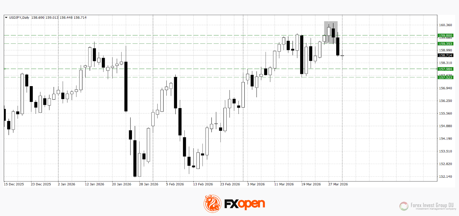 Пара USD/JPY после обновления максимумов текущего года и теста психологического уровня 160.00 перешла к снижению, формируя коррекционное движение. Технический анализ USD/JPY указывает на возможность снижения в область 157.50–158.00, так как на дневном таймфрейме сформирована комбинация «тёмные облака». В случае закрепления цены выше диапазона 159.40–159.80 сценарий нисходящей коррекции может быть отменён.