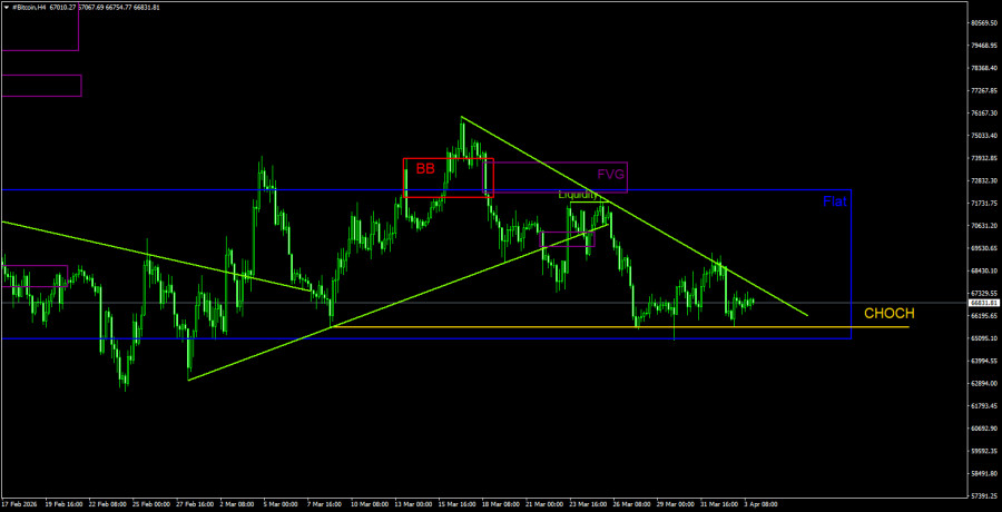 На 4-часовом таймфрейме цена опустилась к нижней границе бокового канала, сформировала девиацию/отскок от нее, а теперь вновь может устремиться к верхней границе канала. Нисходящая линия тренда(пул ликвидности) как раз выступает отличной целью. Линия CHOCH, которая является опорой для восходящей коррекции, пролегает на уровне 65 500$, и она не была преодолена. Значит коррекция продолжается. Преодоление этой линии укажет на завершение коррекции, которая длится уже полтора месяца. Если флэт сохраняется, внутренние паттерны не имеют никакого значения. Мы сейчас больше доверяем дневному графику, но флэт на 4-часовом ТФ тоже не отменяется окончательно.Рекомендации по торговле BTC/USD: