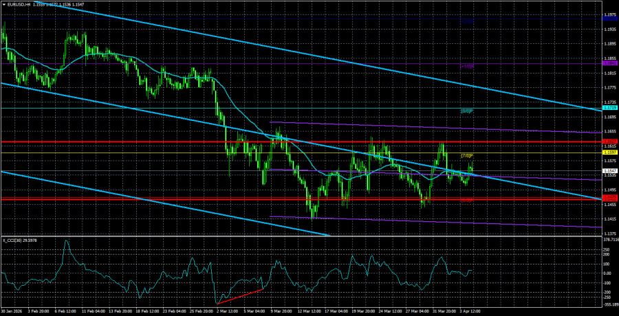 Валютная пара EUR/USD в течение понедельника продолжала торговаться очень слабо и неохотно. В принципе, это не удивительно, ибо по католическому календарю 6 апреля – Пасхальный понедельник. Во-первых, это праздник. Во-вторых, уже 6 апреля Дональд Трамп мог отдать приказ о проведении новой воздушной операции в Иране. Таким образом, трейдеры с самого начала не были настроены на открытие позиций. По прошествии нескольких недель можно с уверенностью сказать, что рынок в принципе уже довольно долгий срок не спешит ни с покупками доллара, ни с продажами. Мы регулярно говорили о том, что каким бы сильным ни был геополитический фактор, рынок не может отрабатывать только его и постоянно его. Война между Украиной и Россией длится уже пятый год, но никто среди инвесторов и трейдеров уже давно не беспокоится по этому поводу. Хотя изначально военные действия в Восточной Европе также оказали серьезное влияние на нефтяные цены и нефтяные потоки. Таким образом, мы считаем, что геополитика уже начала отходить на второй план. Пока что это лишь начальный этап отхождения, так как макроэкономический фон рынок продолжает игнорировать. Тем не менее, мы уже не видим ежедневного роста доллара, хотя ситуация на Ближнем Востоке лучше не становится. На наш взгляд, рынок находится даже не в выжидательной позиции, а в позиции последней надежды. Дональд Трамп в третий раз перенес конечный срок, к которому Иран должен успеть открыть Ормузский пролив. Теперь он истекает сегодня в 20-00 по американскому времени. Что будет дальше – вероятно, все догадываются. Иран же продолжает занимать свою позицию и не готов идти ни на какие уступки. О переговорах между Тегераном и Вашингтоном мы слышим только из уст Трампа, но согласитесь крайне сложно верить в наличие переговоров, если практически каждый день Трамп угрожает полным уничтожением Ирана. Мы считаем, что в текущих обстоятельствах лучше всего поможет гадание на кофейной гуще. Действия Трампа предугадать невозможно, наличие переговоров Иран не подтверждает, многочисленные инсайды зачастую противоречат друг друга, ибо у каждого журналиста свой источник, а источники делятся совершенно разной информацией. Поэтому, как и раньше, лучше всего дождаться достоверной информации и работать с ней. Мы же лишь напомним, что в данное время все фундаментальные, макроэкономические и технические факторы не имеют никакого значения. Цена в последние несколько недель прыгает то вверх, то вниз, но не потому, что находится во флэте, а потому что геополитический фон постоянно меняется. Примерно каждые два дня. Этот тот редкий случай, когда боковое движение полностью отражает новостной фон. Что касается среднесрочной перспективы пары EUR/USD, то мы по-прежнему считаем: если конфликт на Ближнем Востоке завершится в ближайшее время, европейская валюта вновь начнет расти и довольно быстро вернется к максимумам текущего года. Шанс доллара заключается только в дальнейшей эскалации на Ближнем Востоке. Средняя волатильность валютной пары EUR/USD за последние 5 торговых дней по состоянию на 7 апреля составляет 79 пунктов и характеризуется, как «средняя». Мы ожидаем движение пары между уровнями 1,1469 и 1,1627 во вторник. Старший канал линейной регрессии развернулся вниз, что указывает на смену тренда. Индикатор CCI заходил в область перепроданности и сформир