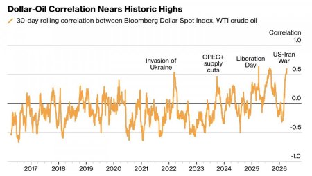 Единственным фактором, который в настоящее время определяет судьбу различных активов, являются цены на нефть. Самый стремительный обвал Brent с 2020 на фоне новости о переговорах США и Ирана подбросил вверх фондовые индексы и обрушил котировки американского доллара. 30-дневная корреляция между гринбэком и черным золотом достигла максимальных отметок со времен объявления Дональдом Трампом максимальных тарифов с 1930-х в апреле прошлого года. Динамика корреляции доллара США и нефти